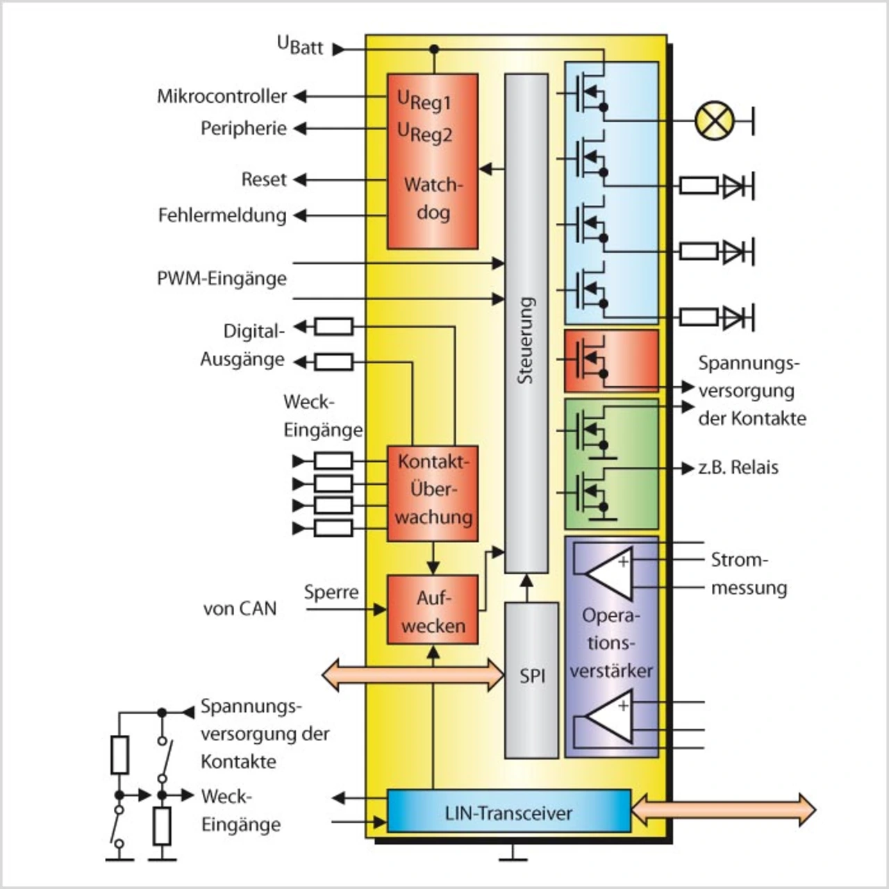 Die heutigen Ruhestromanforderungen für Steuergeräte liegen mittlerweile unter 100 μA, wobei zunehmend auch gefordert wird, die Stromaufnahme im Betrieb zu reduzieren. Diese Anforderungen können nur durch niedrige Ruheströme der verwendeten Bauelemente, vor allem jedoch durch intelligente Power-Management-Konzepte erreicht werden. Obwohl die derzeit verfügbaren Spannungsregler in BCD-Technologie (Bipolar, CMOS, DMOS) bereits auf geringe Ruheströme optimiert sind, reicht dies nicht aus, um den Ruhestromverbrauch des gesamten Moduls unter die Grenzwerte zu senken. Hierzu sind spezielle, auf diese Anforderung zugeschnittene ICs erforderlich. Die Steuergeräte werden dabei in einen Bereitschaftsbetrieb mit niedrigem Ruhestrom geschickt, wobei es jedoch häufig erforderlich ist, den Mikrocontroller in einem Stoppoder Halt-Modus weiter zu versorgen. Der eingesetzte Spannungsregler muss in diesem Fall ebenfalls seinen Ruhestrom reduzieren und gleichzeitig in der Lage sein, sehr kurzfristig den Betriebsstrom des Controllers zu liefern, wenn das System wieder aufwacht.