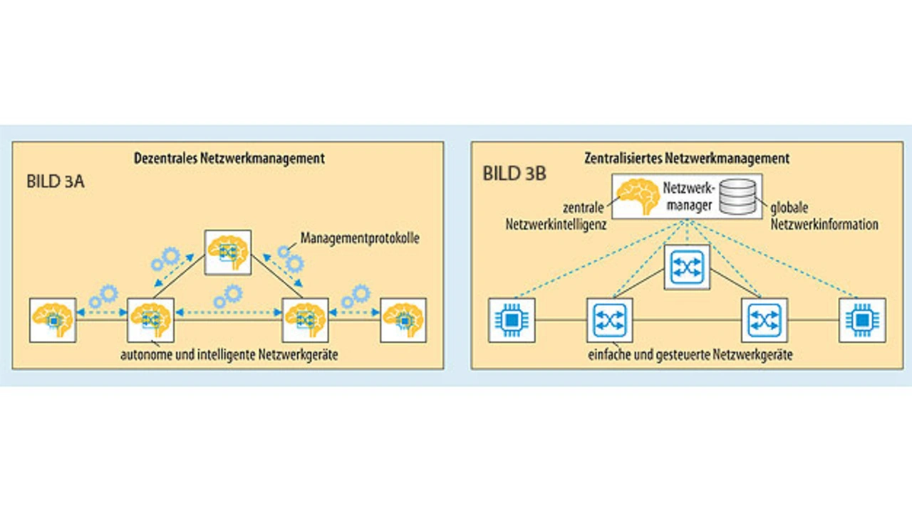 Im Internet und dem überwiegenden Teil der Enterprise-IT erfolgt das Netzwerkmanagement heutzutage autonom und dezentral. Die einzelnen Netzwerkgeräte kümmern sich zur Laufzeit jeweils selbstständig um ihre Konfiguration (Bild 3a). Die Kontrollentscheidungen werden aufgrund der zur Verfügung stehenden Informationen jeweils lokal getroffen. Das erfolgt in Abstimmung mit den direkten Nachbarn im Netzwerk. Hierfür sind zweck- und problemgebundene Managementprotokolle implementiert, die zum Informationsaustausch mit Nachbarnetzwerkgeräten dienen. Weil jedes Netzwerkgerät eigenständig Entscheidungen trifft, müssen diese entsprechend mit Intelligenz ausgestattet sein.