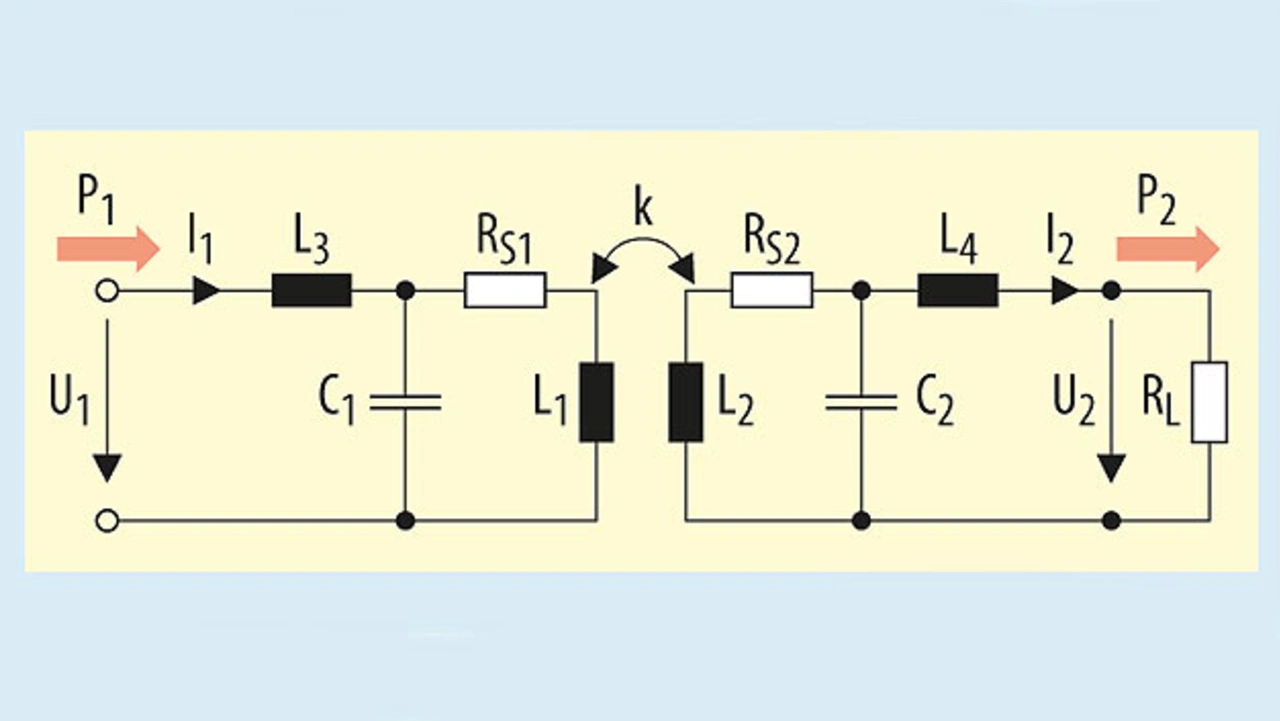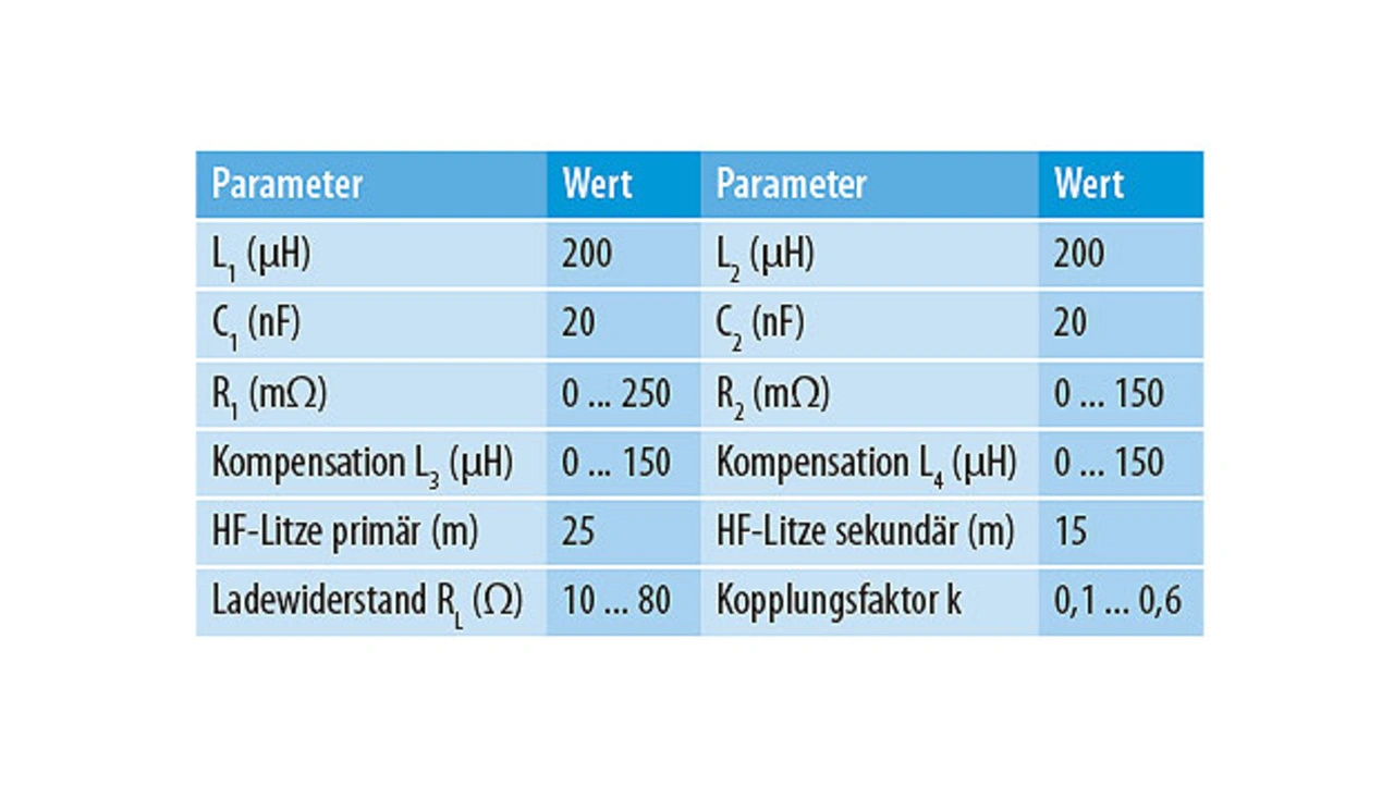 Mit Hilfe einer Schaltungssimulation wurde der Einfluss der vorgestellten Parameter eines WPT-Systems untersucht. Das verwendete Simulationsmodell ist in Bild 4 dargestellt. Die Schaltung besteht aus den beiden Resonanzkreisen mit L1 und C2 für die Primärseite und L2 und C2 für die Sekundärseite. Die Verluste in den WPT-Spulen wurden durch die Widerstände RS1 und RS2 berücksichtigt. Auf der Sekundärseite befindet sich der Lastwiderstand RL, der die Batterie nachbildet.