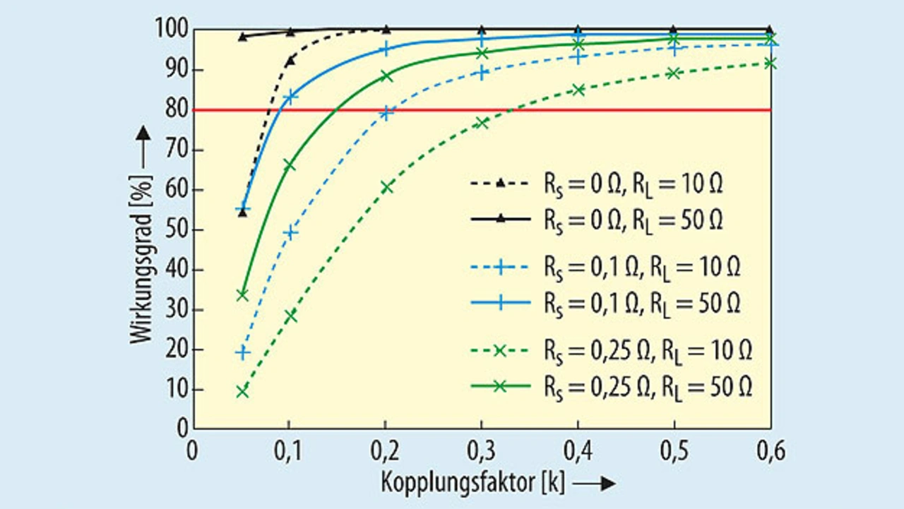 Während die Transfer-Effizienz bei mittlerer und guter Kopplung für die verschiedenen Lastwiderstände noch über 80 Prozent beträgt, lässt sich im Fall einer schwachen Kopplung von k = 0,1 nur eine unbefriedigende Effizienz von weniger als 80 Prozent erwarten.