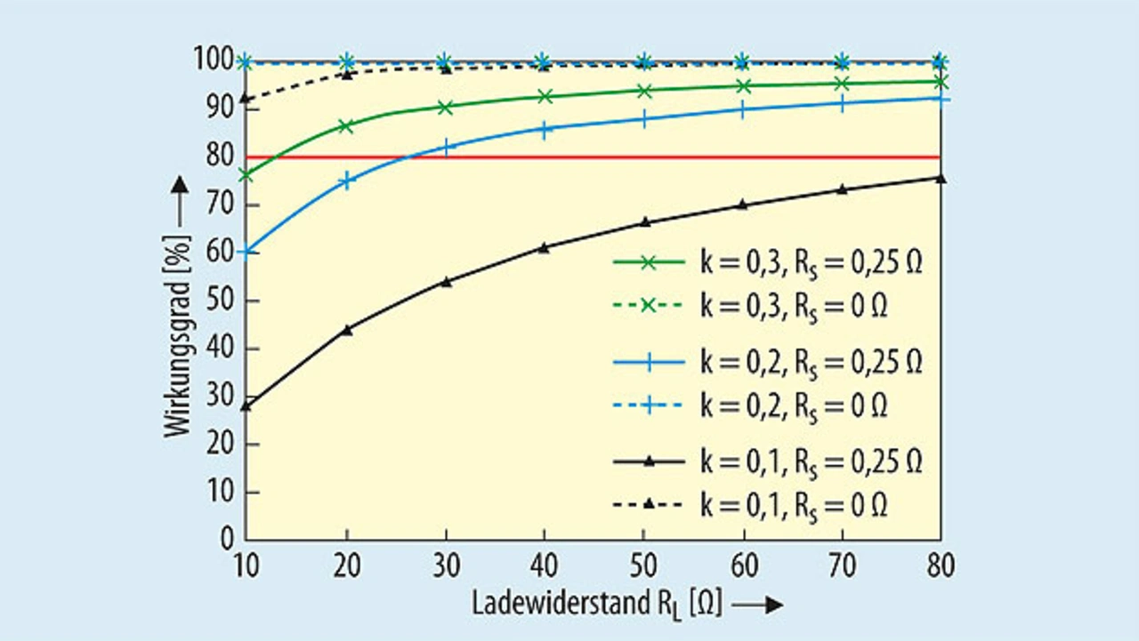Wie man sieht, beeinträchtigt auch die Höhe des Lastwiderstandes das Ergebnis. Bei hohen Spulenverlusten RSv und hohem Lastwiderstand RL beträgt die Transfer-Effizienz selbst bei guter Kopplung von k = 0,3 stets weniger als 80 Prozent.