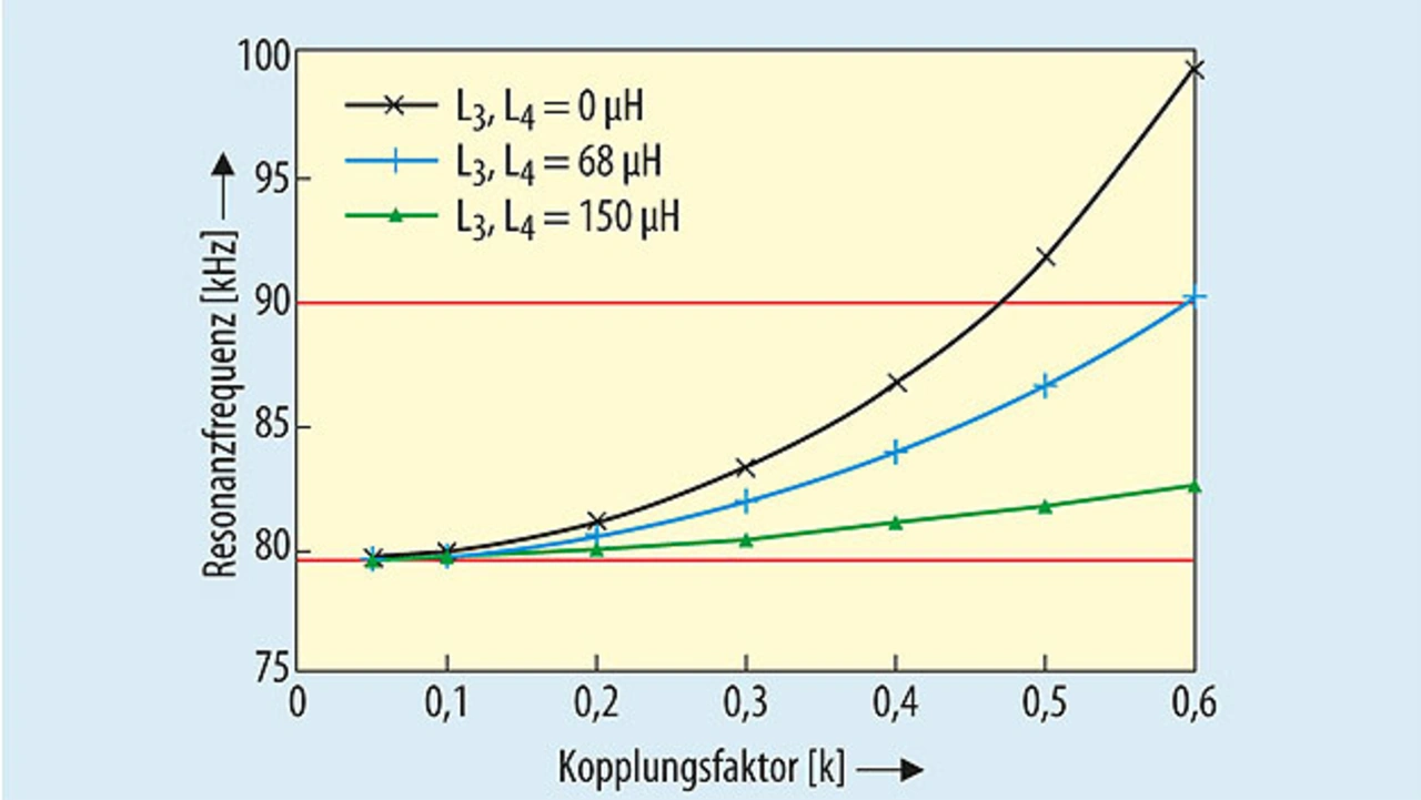In einem weiteren Schritt wurde der Einfluss des Koppelfaktors k auf die Resonanzfrequenz f0 untersucht. In Bild 7 ist die Resonanzfrequenz als Funktion des Koppelfaktors k aufgetragen. Ohne Kompensationsspulen L3 und L4 verändert sich die Resonanzfrequenz deutlich mit dem Koppelfaktor k, in dem berechneten Beispiel zwischen 79 und 100 kHz, und liegt somit außerhalb des für die WPT-Anwendungen vorgesehenen Frequenzintervalls von 79 bis 90 kHz. Zudem erhöht die große Frequenzänderung die Ansprüche an den Abstimmkreis im Inverter oder im Resonanzkreis, was zusätzlichen Aufwand und damit höhere Kosten bedeutet.