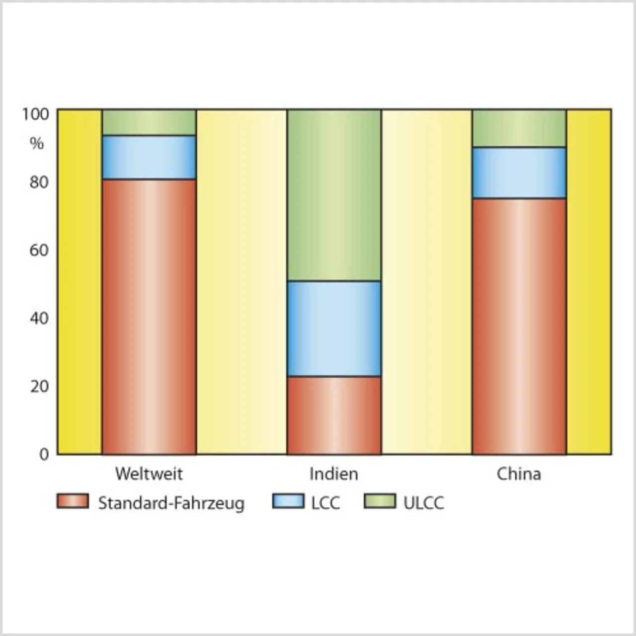 Strategy Analytics geht davon aus, dass das ULCC-Segment in den kommenden Jahren der wachstumsstärkste Bereich des Kfz-Markts sein wird, und prognostiziert, dass der ULCCMarkt (Verkaufspreis unter 5000 Dollar) bis 2015 auf eine Jahresproduktion von 6,8 Mio. Fahrzeuge anwachsen wird, was einer durchschnittlichen jährlichen Zuwachsrate von 34 Prozent im Zeitraum von 2007 bis 2015 entspricht (Bild 2). Dagegen wird für das LCC-Segment (5000 bis 10 000 Dollar) ein Anstieg auf 11,4 Mio. Einheiten bis 2015 erwartet. Das Wachstum ist geringfügig höher als das des gesamten Markts für leichte Fahrzeuge, das im gleichen Zeitraum etwa drei Prozent betragen wird. Die rasch wachsenden Volkswirtschaften von Staaten wie Indien und China kurbeln die entsprechende Nachfrage an, während die Autohersteller mit erschwinglicheren Fahrzeugen auf die wachsende Mittelschicht zielen.