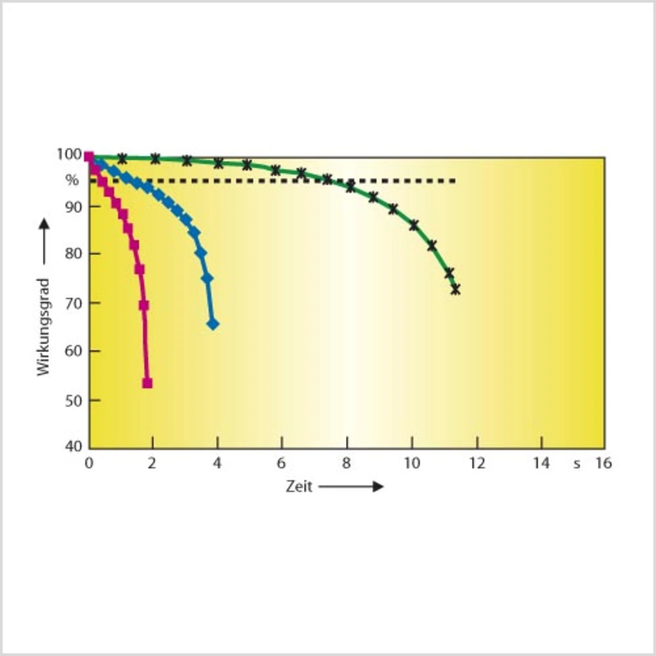 Untersuchungen zeigen, dass durch den extrem geringen Innenwiderstand des Ultrakondensators und die damit einhergehende hohe Effizienz bei relativ hohen Leistungen ein Wirkungsgrad von >90 % realistisch ist. Bild 7 stellt das Ergebnis einer Untersuchung bei konstanter Leistung dar. Die Effizienz ist =95 % bei Puls-Intervallen von 8 s bei 10 % Pml, über 2 s bei einem Viertel Pml bis hin zu 1 s bei 40 % Pml. Bei Ultrakondensatoren, die für Automobil-Anwendungen entwickelt wurden, liegt die Gesamt-Effizienz bei 95 % ... 98 %. Um die anspruchsvollen Anforderungen der Automobilindustrie zu erfüllen, wurden Energiespeicher in den letzten Jahren enorm weiterentwickelt. Derzeit können aber weder Li-Ionen-Zellen alleine die Anforderungen erfüllen, da beispielsweise ein signifikanter Anteil der Leistungsfähigkeit bei Temperaturen unter –10 °C verlorengeht, noch stellen Ultrakondensatoren aufgrund der geringeren Energiedichte eine Alternative dar. Um die konträren Vorteile beider Systeme optimal nutzen zu können, ist die aktiv-parallele Kombination von Ultrakondensatoren mit Li-Ionen-Akkus empfehlenswert.
