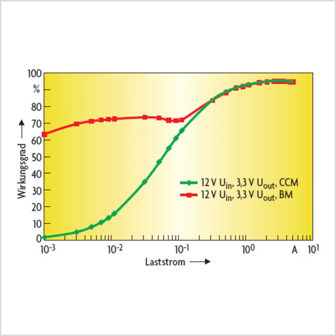 In batteriebetriebenen Applikationen spielen zwei Betriebszustände eine Rolle, nämlich der Stand-by-/Sleep-Modus, in dem die Ruhestromaufnahme überwiegt, und der Betrieb mit voller Ausgangsleistung. Da Lastströme zwischen beiden Extremen selten vorkommen, spielt der Wirkungsgrad in diesem Bereich eine untergeordnetere Rolle als das Verbessern der Ausgangswelligkeit unter sämtlichen Bedingungen im Burst Mode. Der LTC3857/-1 ist deshalb für eine begrenzte Welligkeit im Burst Mode optimiert und nicht für einen höheren Wirkungsgrad bei mittleren Ausgangsleistungen.