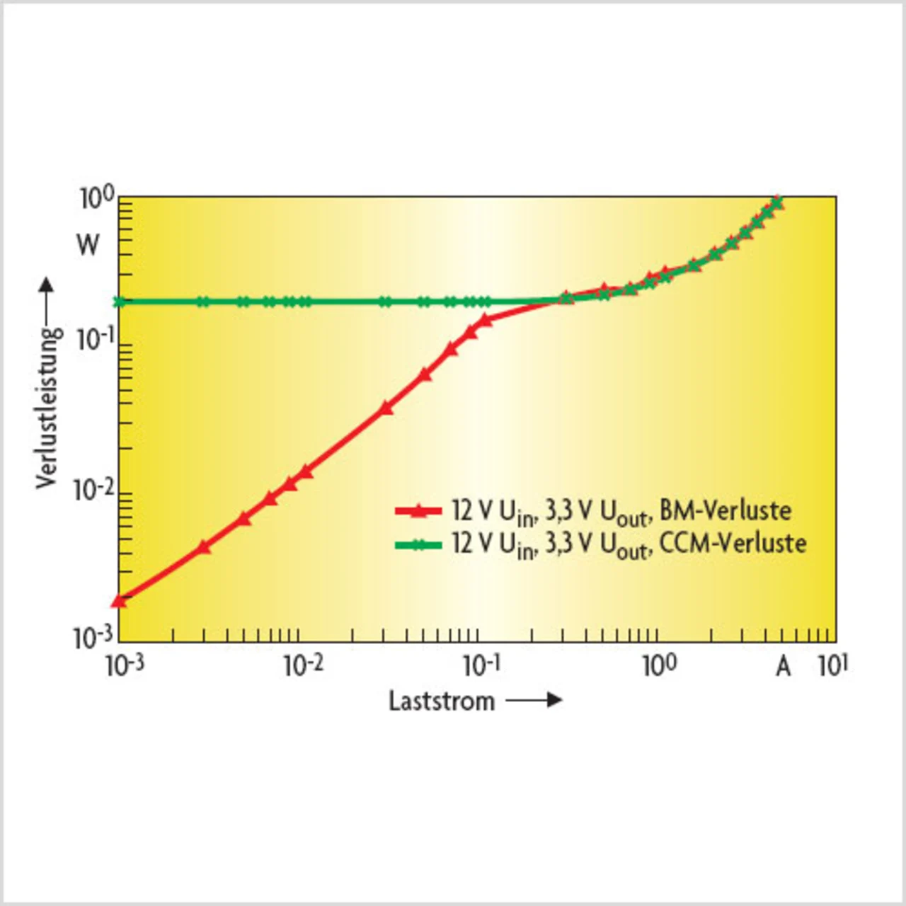 Die Verluste im Burst Mode und in der CCM-Betriebsart sind in Bild 2 gegenübergestellt. Interessant ist die konstante Verlustleistung des Wandlers im CCM-Betrieb, wenn der Laststrom am Ausgang kleiner ist als ca. 300 mA. Ursächlich hierfür ist, dass die Schaltverluste infolge des Ein- und Ausschaltens der externen MOSFETs bei geringer Ausgangslast den größten Anteil an den Verlusten haben. Im Burst Mode bei niedriger Ausgangsleistung variiert dagegen die Verlustleistung entsprechend der jeweils abgerufenen Ausgangsleistung.