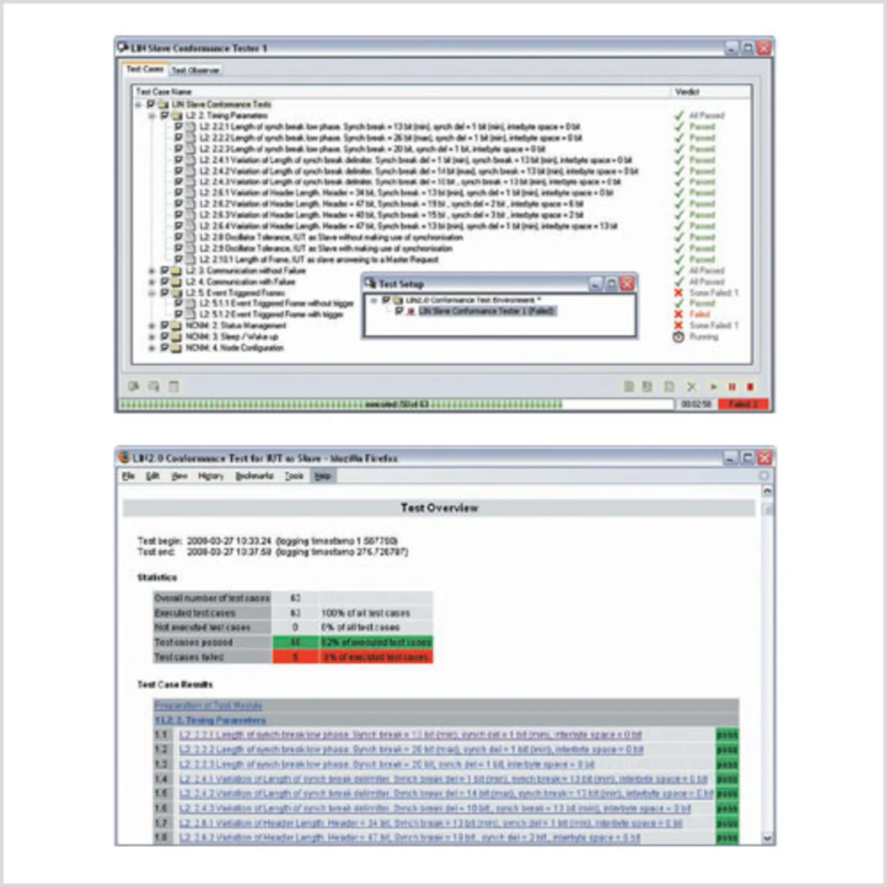 Angesichts von bis zu 70 LIN-Knoten in einem Fahrzeug gewinnen effiziente Teststrategien für die LIN-Conformance-Tests erheblich an Bedeutung. Diese verifizieren, ob der Prüfling die entsprechende Protokollspezifikation einhält und dienen als Basis für die Akkreditierung. Da LIN-Netze nach dem Master-Slave-Prinzip arbeiten, ist die Protokollkonformität des Masters von zentraler Bedeutung. Die LIN-Conformance-Tests sind für die verschiedenen OSI-Layer spezifiziert: Physical Layer, Data Link Layer und Network Management sowie Node Configuration. Die Application Layer Tests sind von OEMs und Zulieferern selbst zu spezifizieren.