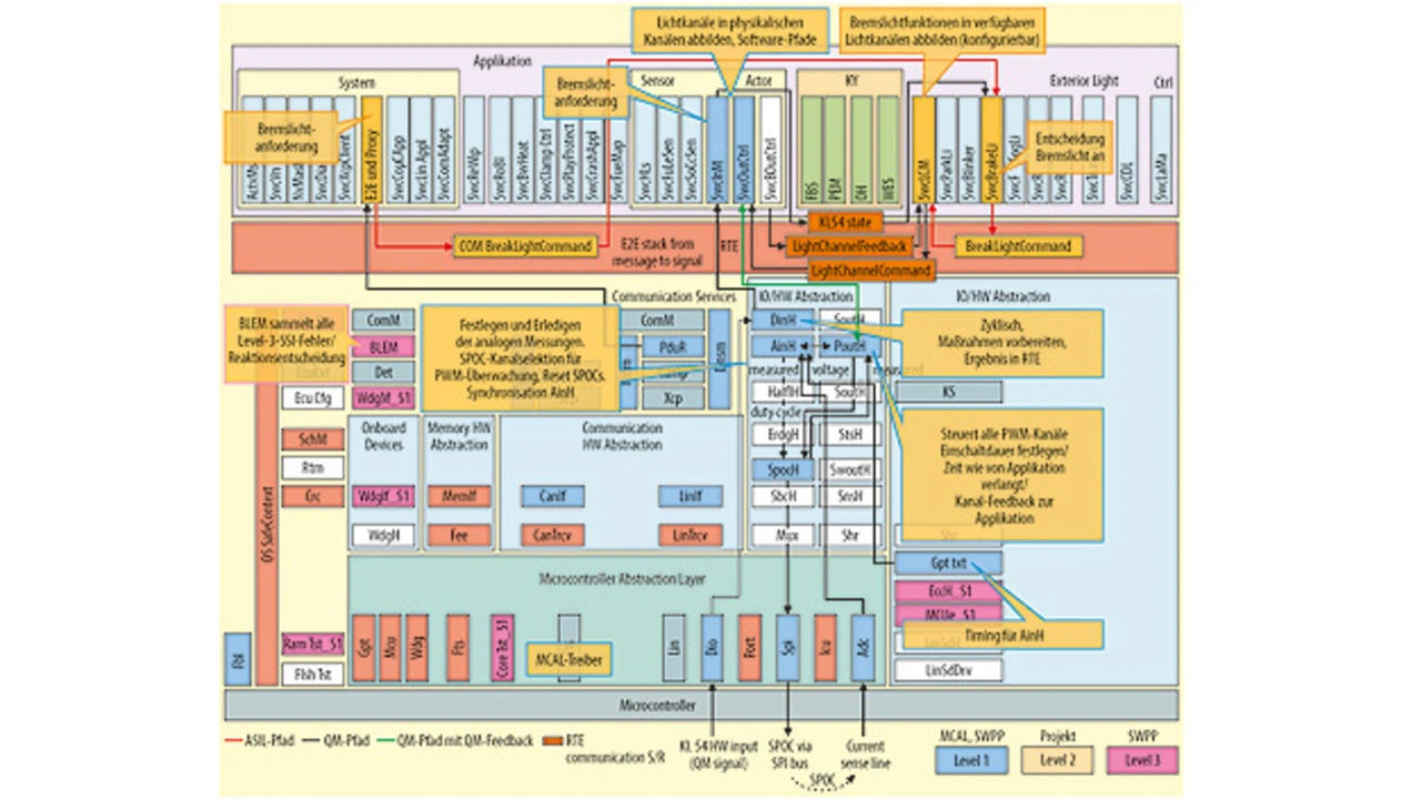 Durch die vorgegebene AUTOSAR-Architektur mit mehreren Schichten und die geforderte flexible Lichtsteuerung für jeden Kanal ist diese umfangreiche Lösung entstanden. Der LCM LightChannelManager nimmt eine zentrale Rolle ein, um Verletzungen der Sicherheitsziele durch Interference mit Hilfe von Software mit Standard-Qualität inklusive FTT festzustellen. Dazu zählen
