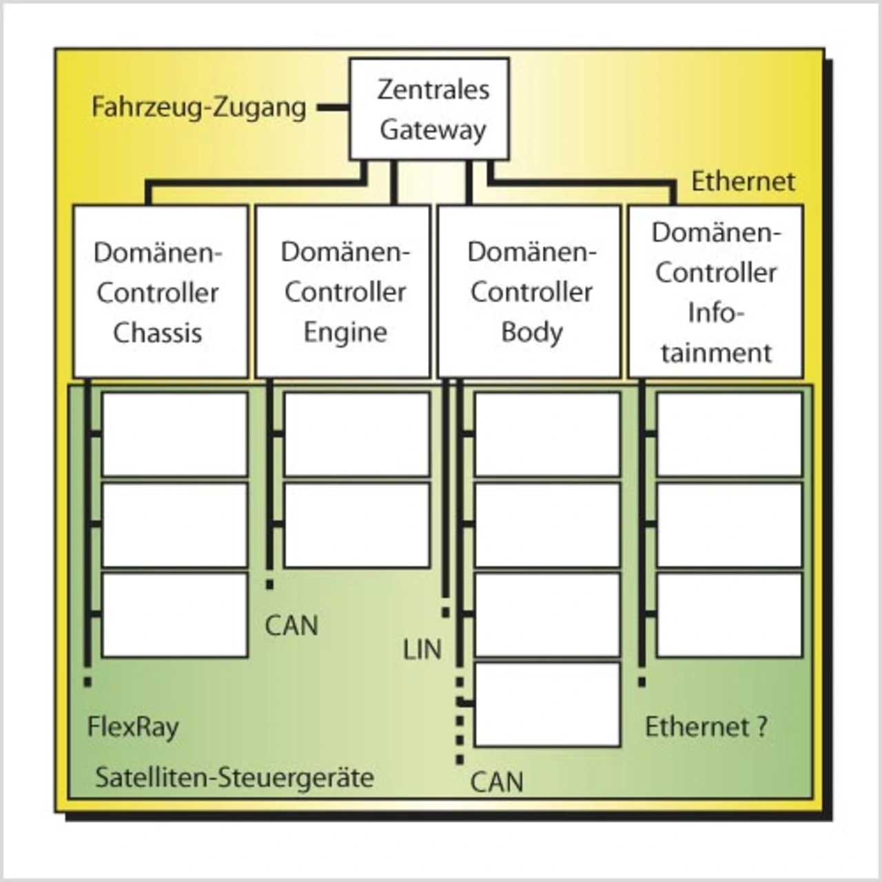 „Wenn man noch ein wenig weiter in die Zukunft blickt, könnte man sich auch noch eine Architekturoptimierung vorstellen“, meint Frickenstein. „Die E/E-Architektur von morgen sollte eine Balance zwischen Kostenoptimierung und Beherrschbarkeit der Komplexität möglich machen, wobei im Mittelpunkt der Industriebaukasten steht.“ Eine solche homogene E/E-Architektur würde hierarchisch aufgebaut sein mit dem zentralen Gateway an der Spitze. An dieses könnten z.B. über Ethernet vier Domänen-Controller (Chassis, Motor, Karosserie, Infotainment) angeschlossen sein, denen wiederum einfachere Satelliten-Systeme nachgeordnet sind und die weiterhin über Busse wie CAN und FlexRay kommunizieren könnten (Grafik). Diese Architektur hat Vorteile wie reduzierte Buslast, vereinfachte Testbarkeit sowie weniger Steuergeräte. In Bezug auf Ethernet seien momentan allerdings weder die Kostenfrage noch die Knoten- und Echtzeit-Frage gelöst. Jedoch böte diese optimierte E/E-Architektur der Autoindustrie die Chance, einerseits sowohl die Domänen-Controller und andererseits auch die Satelliten-Systeme zu standardisieren und diese allen OEMs und Zulieferern zugänglich zu machen. Dazu Frickenstein: „Aus meiner Sicht sind die daraus resultierenden Vorteile so überzeugend, dass wir – ähnlich wie bei AUTOSAR – eine europäische Initiative brauchen. Erste Gespräche sind schon geführt, aber wir stehen noch ganz am Anfang.“ Günther Klasche/sj