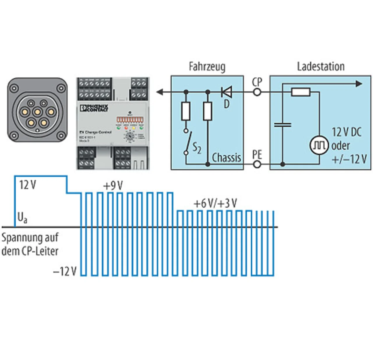 Als Grundlage für das Energie-Management beim Laden von Elektrofahrzeugen fungieren die Normen IEC 61851-1 und künftig die ISO 15118. Die in der IEC 61851-1 definierte Control-Pilot-Funktion lässt sich gemäß Annex A des Standards über ein genormtes pulsweitenmoduliertes Signal ausführen (Bild 3). Dabei informiert das Tastverhältnis des Signals das Elektrofahrzeug über den maximal lieferbaren Ladestrom, den es einhalten muss. Dies erfolgt über einen der beiden Signalkontakte des Ladesteckers. Der EV Charge Controller, der mit der Schnittstelle zum Fahrzeug und dem Ladeschütz verbunden ist, erfüllt die Funktion des Control Pilot. Das Gerät ist mit einer seriellen Modbus/TCP-Schnittstelle ausgerüstet, so dass jedem Elektrofahrzeug auf dem Parkplatz ein eigener Ladestrom zugewiesen werden kann. Ein einfaches regelbasiertes Last-Management übernimmt dazu die Priorität der einzelnen Fahrzeuge aus dem Fuhrpark-Management und generiert in Abhängigkeit von der Lastsituation die entsprechenden Vorgaben im Netz sowie am Anschlusspunkt. Das Energie-Management lässt sich erweitern, indem beispielsweise Erzeugungswerte aus einer Photovoltaik-Anlage einbezogen und die Anteile des Eigenstromverbrauchs wirtschaftlich günstig erhöht werden.