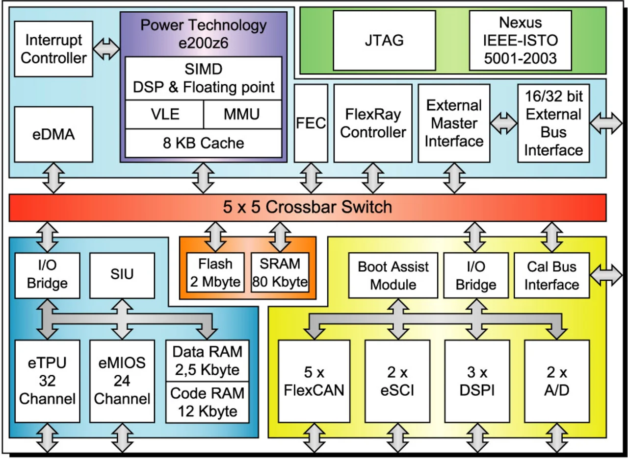 128 Kbyte Flash ausgestattet, sind für 2007 noch weitere Familienmitglieder mit bis zu 512 Kbyte geplant. Die Bausteine der MC9S12XF-Familie basieren auf dem 16-bit-S12X-Kern, dem zur Leistungssteigerung ein 16-bit-XGATE-Coprozessor zu Seite gestellt wurde. Auch im Bereich der 32-bit-Prozessoren bietet Freescale verschiedene Varianten an [7]. Mit dem MPC5567 wurde bereits im Herbst 2006 ein Baustein mit dem leistungsfähigen e200z6-Kern vorgestellt, der in Powertrain-Applikationen eingesetzt werden soll (Bild 2). Die Auswahl an Schnittstellen, beispielsweise der Ethernet-Controller oder die eTPU (enhanced Time Processor Unit), mittels derer ein MediaLB-Interface nachgebildet werden kann, prädestinieren den Baustein aber auch für andere Anwendungen, wie etwa einem zentralen Gateway. Ähnlich aufgebaut, aber mit mehr SRAM-Speicher und weniger Schnittstellen nach außen, zielt der MPC5561 auf sicherheitskritische Systeme oder Fahrerassistenzsysteme. Der Prozessorkern und ein Großteil der Peripherieblöcke sind mit dem MPC5567 identisch.
