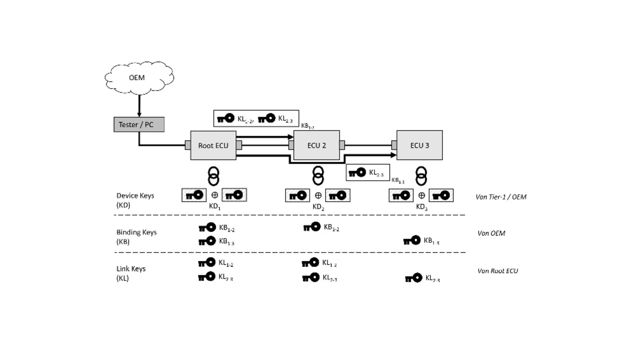 Die oberste Ebene der Schlüsselhierarchie nutzt sogenannte Device Keys, die wiederum aus zwei gleich langen Schlüsseln pro Steuergerät gebildet werden: Dem „Tier-1 Device Key“ und dem „OEM Device Key“. Der Tier-1 Device Key wird durch den Tier-1 bei der Fertigung des Steuergeräts persistent eingebrannt und hiermit dem Steuergerät in Kombination mit einer eindeutigen Identifikationsnummer des Halbleiters eine eindeutige, gesicherte Identität gegeben. Diese kann für weitere Prozesse dem OEM bekanntgegeben werden. Die zweite Schlüsselkomponente wird vom jeweiligen OEM bei der Produktion des Fahrzeugs im Werk geschrieben, wodurch das Bauteil nun an den OEM gebunden ist und dieser die Kontrolle und Verantwortung über das Steuergerät übernimmt.