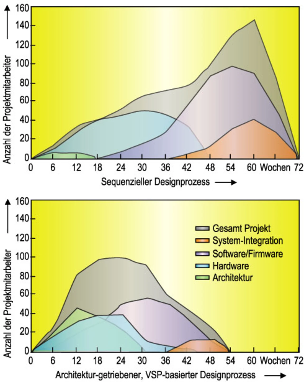 Man beachte in Bild 4 die Ressourcenanforderungen, Risikofaktoren und Entwicklungszeiten, die mit dem konventionellen Prozess verbunden sind, und zwar im Vergleich zum parallelen VSP-basierten Designprozess (unten im Bild). Jedes Schaubild zeigt Schemata für die Bereitstellung von technischen Ressourcen während des Projektablaufs: