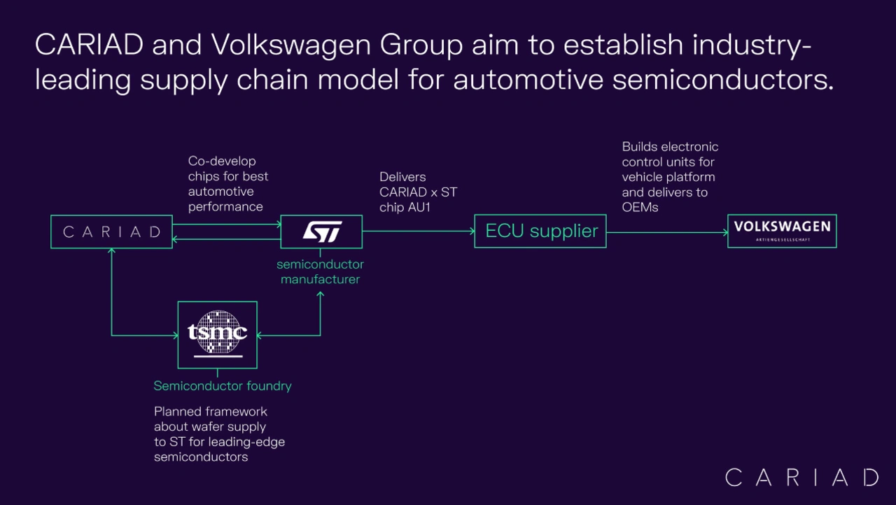 Die Kooperation soll der neuen Fahrzeug-Generation des Volkswagen-Konzerns zugutekommen, die auf der einheitlichen, skalierbaren Software-Plattform von Cariad basieren wird. Cariad und STMicroelectronics haben sich darauf verständigt, dass TSMC künftig für ST die für das System-on-Chip benötigten Wafer fertigen soll. Damit will Cariad die Chip-Versorgung für die Autos des Volkswagen Konzerns bereits Jahre im Voraus absichern.