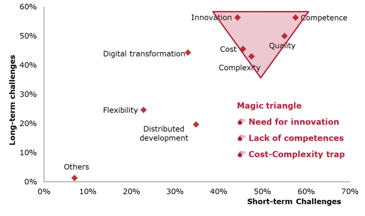 Seit Jahrzehnten ist bekannt, dass ein magisches Dreieck drei Eckpunkte hat – nämlich Qualität, Kosten und Zeit. Mit der neuen Normalität entsteht ein neues Dreieck mit den Dimensionen: Innovation, Kompetenzen und Komplexität. Innovation wird von den Teilnehmern der Studie weiterhin als die größte Herausforderung angesehen.