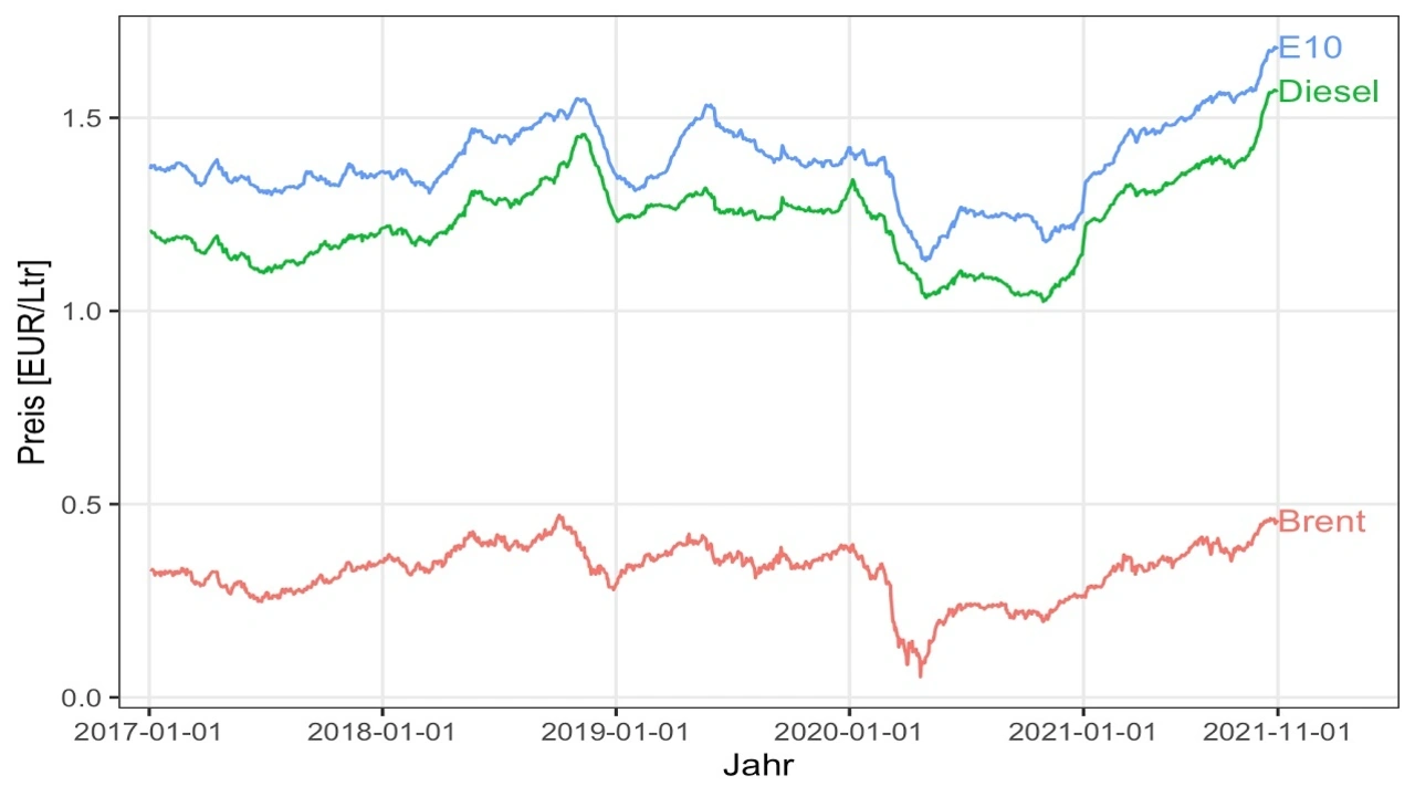 Die Gründe für die derzeit hohen Preise liegen neben den hohen Rohölpreisen auch in einem schwächeren Euro sowie zu einem geringen Teil auch in der 2021 eingeführten CO2-Bepreisung fossiler Brenn- und Kraftstoffe, die Benzin und Diesel um rund sieben bzw. acht Cent je Liter verteuert.