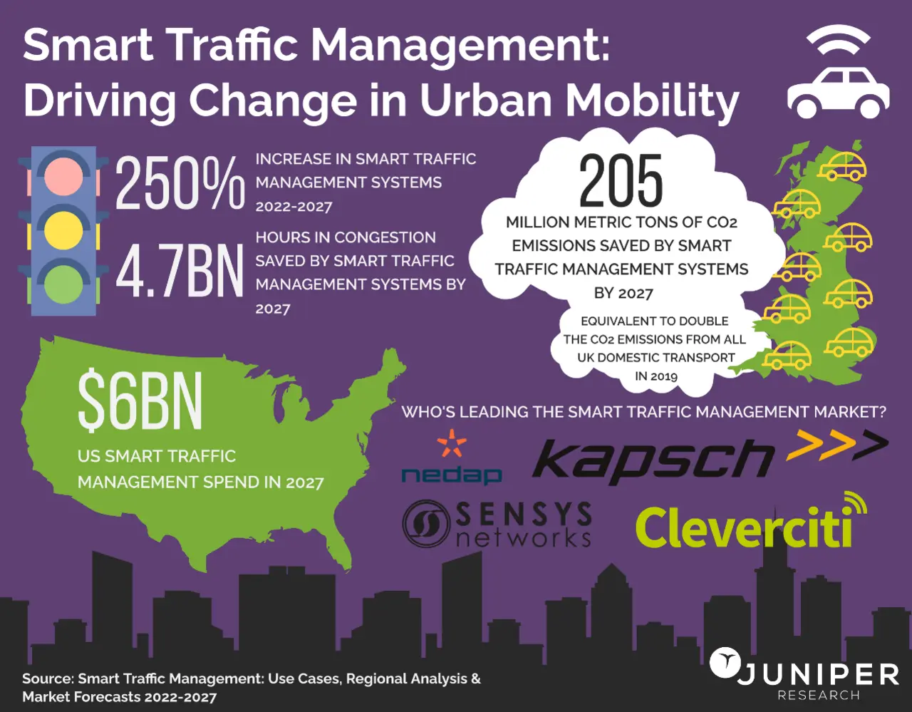 Bis 2027 lassen sich durch intelligente Verkehrsmanagementsysteme weltweit 205 Mio. Tonnen CO2 einsparen, und damit deutlich mehr als noch in diesem Jahr. Das prognostiziert eine neue Studie von Juniper Research.