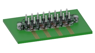 Die für den Automotive-Bereich entwickelte Platine hat eine Größe von etwa 6 cm und verfügt über 19 plus drei oder 24 plus drei Pins, die für die Zuführung oder Abnahme der Steuersignale im Getriebe benötigt werden. Würden alle notwendigen Pins starr in den Kunststoffträger eingebunden, könnte das Bauteil den mechanischen Druck beim Ausdehnen- oder Zusammenziehen nicht ausreichend abfedern. Die Folge wäre eine hohe mechanische Kraft, die auf die einzelnen Lötpunkte der Platine wirken würde. Fehler wären so nicht auszuschließen.