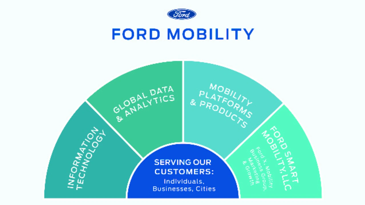 Mobility Platforms and Products: Die Ford Mobility Group wird Design und Entwicklung übernehmen, einschließlich Connectivity, FordPass-Plattformelemente, Fahrzeugmanagement als Dienstleistung, Transport-Services, sowie Plattformen im Bereich autonomer Fahrzeugpartnerschaften.