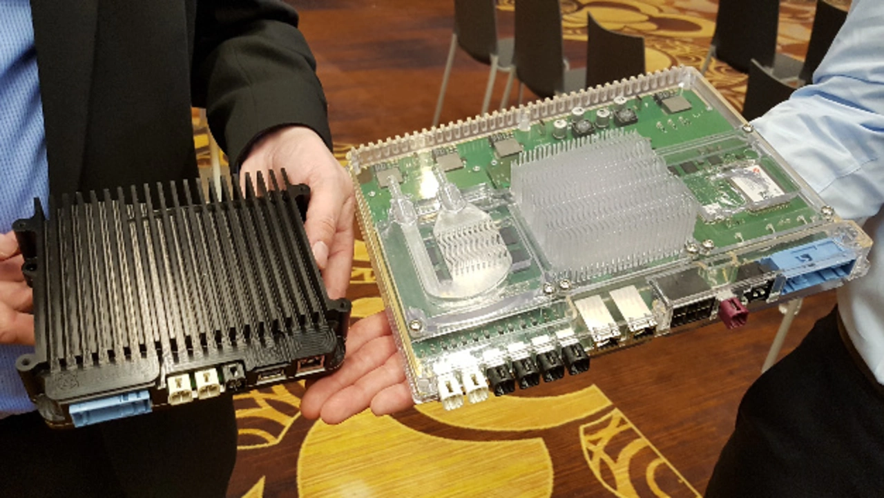Darüber hinaus zeigte ZF auf der CES den Prototypen der 3. Generation von ProAI, eine Box, die sich mit maximal drei Platinen bestücken lässt und verschiedene Kühloptionen (Flüssigkeitskühlung, Kühlkörper) bietet. Die drei Platinen können mit Nvidia-Chips oder auch mit FPGAs, beispielsweise von Xilinx, bestückt sein.