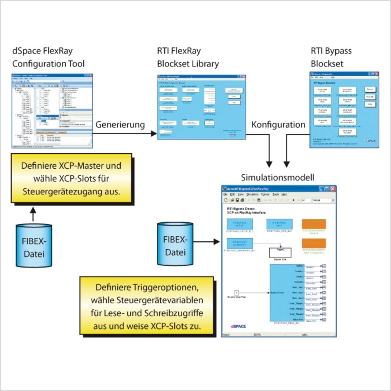 Zur Konfiguration der XCP-on-Flex-Ray-Schnittstelle in Matlab/Simulink setzt das RTI Bypass Blockset auf das bereits etablierte RTI FlexRay Configuration Tool von dSpace auf. Im Configuration Tool wird die FIBEX-Datei geladen und neben der übrigen FlexRay-Kommunikation auch der XCP-Anteil konfiguriert. Das Ergebnis dieser Konfiguration ist eine RTI FlexRay Blockset Library, deren Blöcke dem Simulationsmodell hinzugefügt werden können.