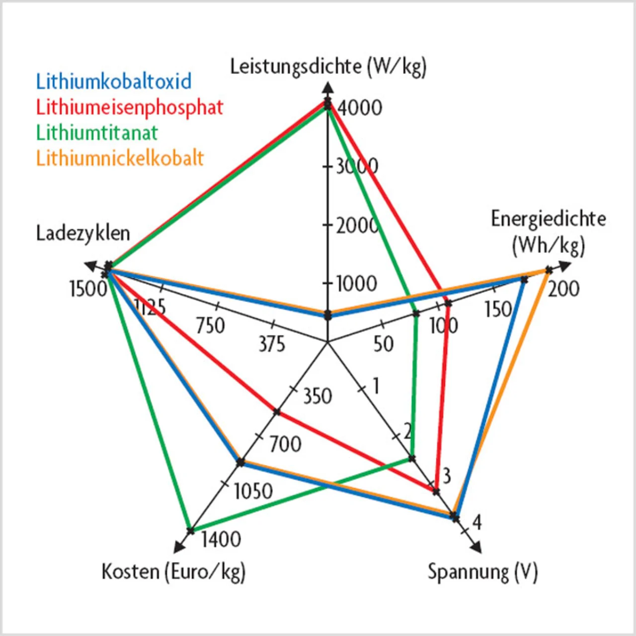Den Lithium-Ionen-Akkus dient Graphit als Anodenmaterial. Die Katode besteht aus Lithium-Metalloxid, meist Lithium-Kobalt-Oxid (LiCoO2). Als Elektrolyt werden Lithium-Salze verwendet, z.B. LiPF6 (Lithiumhexafluorophosphat). Um die Leistungsfähigkeit und Sicherheit zu verbessern, wird weiterhin am Katodenmaterial geforscht. Allerdings erkauft man sich mit der Stärke eines Katodenmaterials eine Schwäche (Bild 4). Lithiumeisenphosphat (LiFePO4) ist sehr hitzebeständig und weist die größte Sicherheit der Lithium-Ionen-Akkus auf, allerdings geht die Sicherheit auf Kosten der Energiedichte. Lithiumtitanat bietet den Vorteil, innerhalb von 10 Minuten rund 80 Prozent der Batterie laden zu können, allerdings schlägt sich das auf den Preis nieder. Experten rechnen damit, dass sich das Lithiumeisenphosphat-System durchsetzten wird, da es vergleichsweise günstig und sehr stabil ist und die größte Sicherheit bietet.