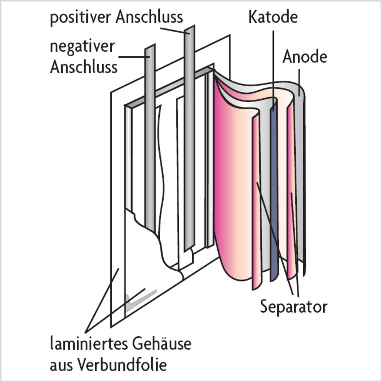 Für die Lithium-Ionen-Zellen gibt es verschiedene Bauformen: Die Flachzelle (Bild 5), auch Coffeepack genannt, und die Prismazelle sind die aussichtsreichsten Bauformen. Ein Hersteller von Flachzellen ist Li-Tec. An der Evonik-Tochter ist Daimler mit 49,9 Prozent beteiligt. Gemeinsam möchten die Unternehmen Forschung, Entwicklung und Produktion von Lithium-Ionen-Akkus für Fahrzeuge vorantreiben. Die Flachzelle besteht aus verschiedenen Schichten. Katode und Anode werden durch einen keramischen Separator getrennt. Anschließend werden die Komponenten mit einem Gehäuse aus Verbundfolie laminiert.Der Vorteil der Coffeepacks ist der geringe Platzbedarf und damit die Abdeckung größerer Leistungsbereiche. Bild 6 zeigt eine Prismazelle.