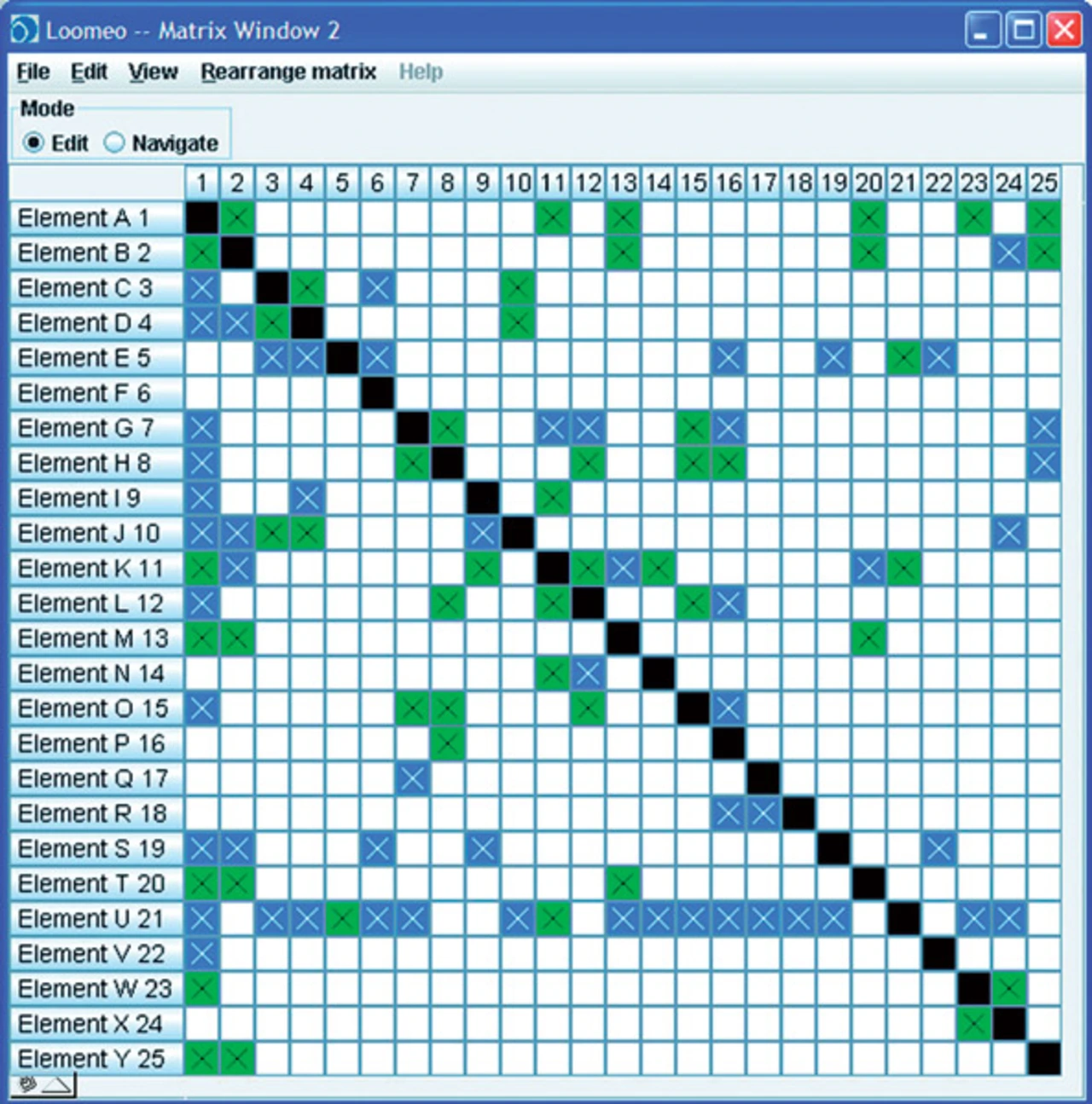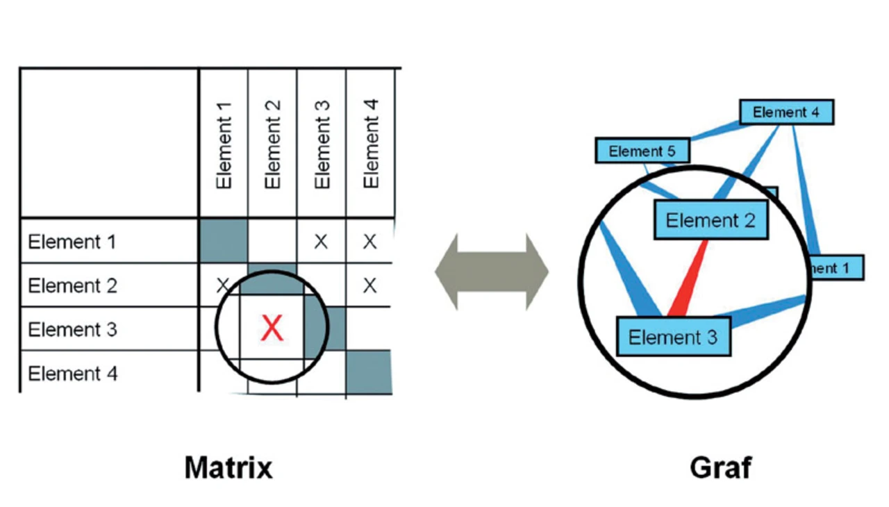 Die Kernkompetenz zur Strukturhandhabung der Teseon GmbH liegt in den entwickelten Software-Werkzeugen. Sie ermöglichen zu jedem Zeitpunkt die dynamisch interaktive Kombination von Matrix- und Grafdarstellung (Bild 1). Das Matrixwerkzeug ermöglicht die einfache Erfassung jeder Struktur. Um signifikante Merkmale in der Struktur zu entdecken, steht ein breites Repertoire an Auswertetechniken zur Verfügung. Dieses reicht von einfachen Standardfunktionen bis hin zu generischen Algorithmen der Systemoptimierung. Die Strukturvisualisierung mittels selbstordnender Grafen schafft dabei das notwendige Systemverständnis auch für ungeübte Anwender. Die Vorgehensweise bei der strukturellen Komplexitätsbeherrschung wird im Folgenden am Beispiel einer erfolgreich durchgeführten Produktoptimierung dargestellt.