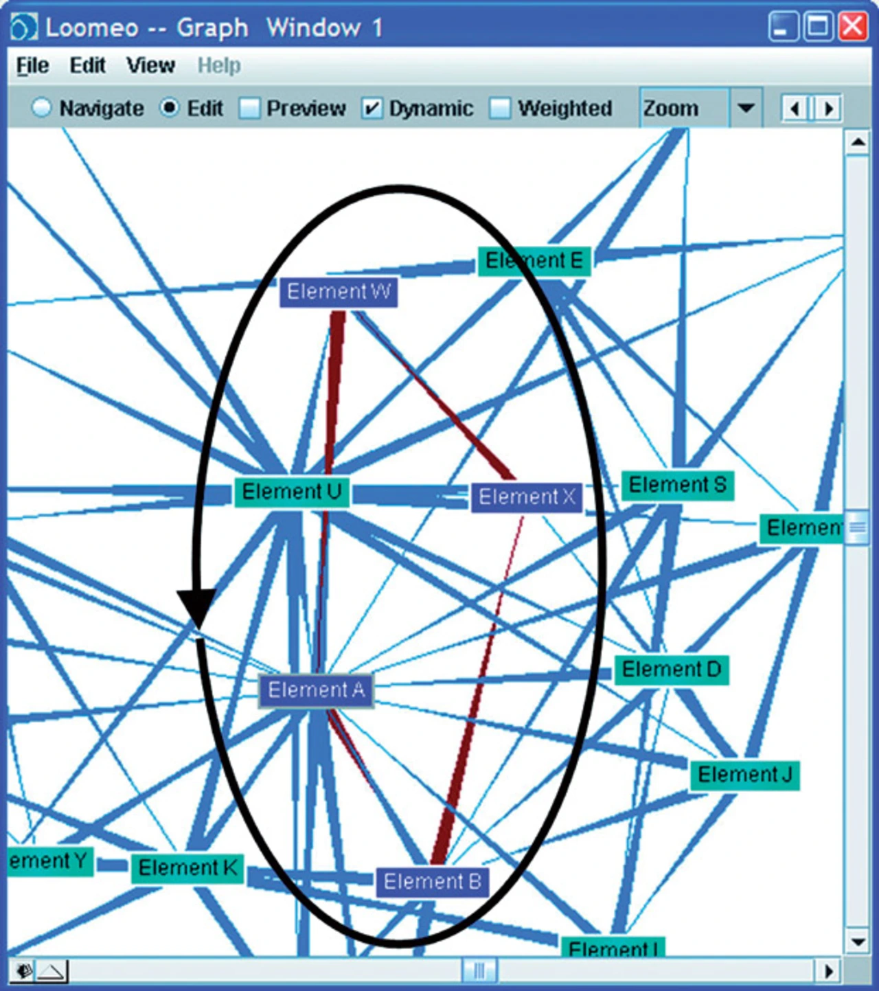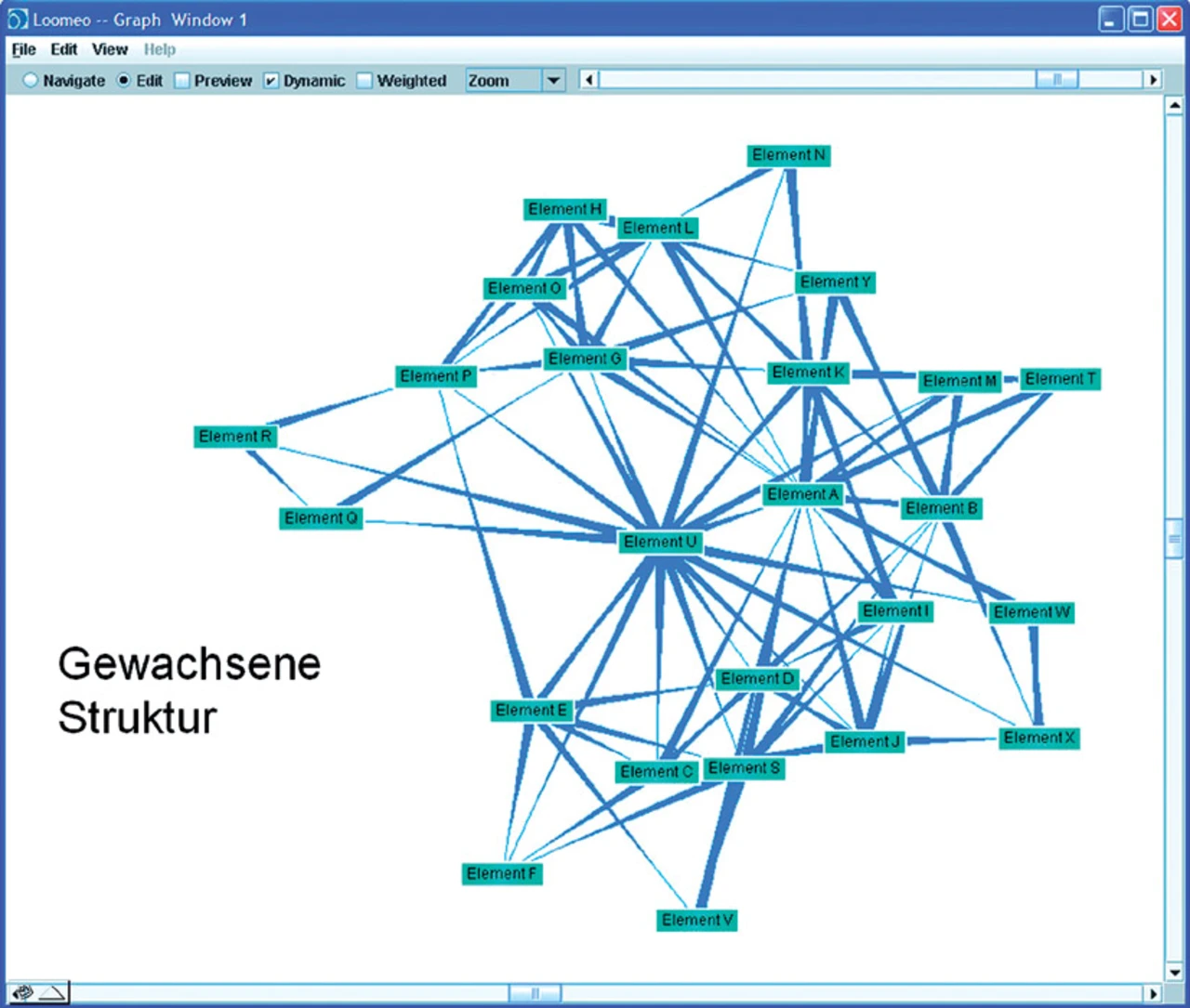 Basierend auf der erfassten Matrix wurde mit dem Grafwerkzeug eine Modellierung der Gesamtstruktur sowie von Teilstrukturen vorgenommen. Grundsätzlich eignet sich auch die Grafdarstellung für die Aufnahme der Strukturinformationen. Die Auswahl des geeigneten Erfassungswerkzeugs ist situationsspezifisch vorzunehmen. Graf- und Matrixwerkzeug können zudem auch dynamisch parallel verwendet werden.