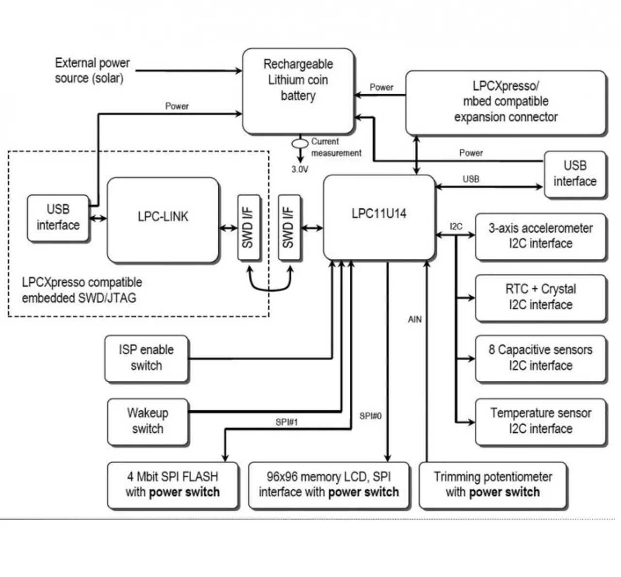 Die geringe Stromaufnahme des Oryx Boards resultiert aus dem Zusammenspiel der auf Effizienz getrimmten Low Power Komponenten. Dazu gehören das Sharp Memory LCD vom Typ LS013B4DN04, die Low Power CPU LPC11U14 MCU von NXP, der Linear Technology Shunt Charger Typ LTC4071 sowie eine Reihe von Sensoren so z.B. der Beschleunigungssensor ADXL345 von Analog Devices (Bild 2: Blockdiagramm).