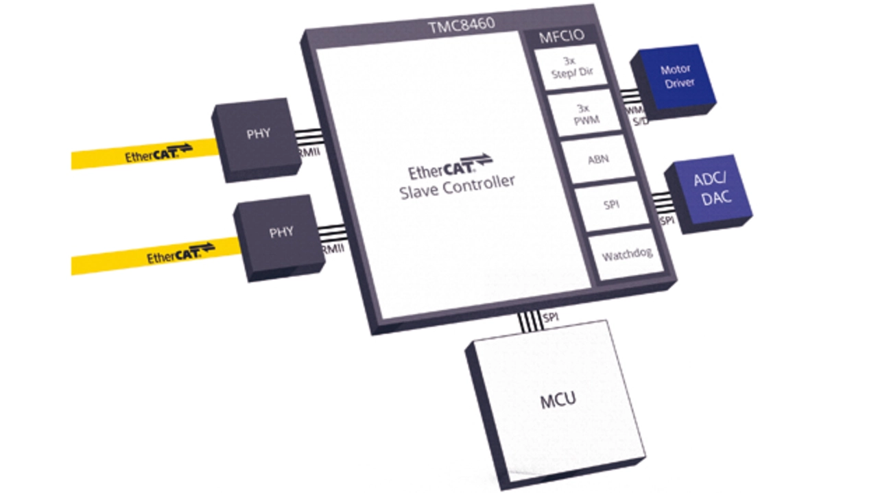 Die Trinamic-Slave-Controller-Linie ist mit Echtzeitperipherie zur schnellen Entwicklung von Drives oder Sensoren ausgestattet und bei MEV erhältlich: »Besonders für unsere Sensor-Kunden ist eine Lösung interessant, bei der Grundfunktionalität und Schnittstelle kombiniert ist, weil hier selten verschiedene Interfaces gleichzeitig gefordert werden. Mit einem TMC846x-Slave-Controller ist es sehr einfach, einen Sensor mit EtherCAT platzsparend und kostengünstig aufzubauen«, sagt Guido Gandolfo, Produkt Line Manager von MEV. Durch die verschiedenen Adaptionsmöglichkeiten über a/b/n-Encoder-Interface, SPI und freien I/Os, seien unzählige Applikationen möglich.