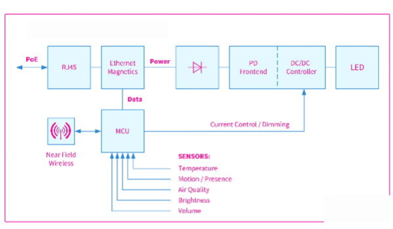 Für den Verbraucher (PD) – hier die PoE-Leuchte – gibt es zwei mögliche Architekturen: Beim reinen PD-Frontend-IC ist nur der zur Umsetzung von PoE relevante Teil vorhanden. Ein PD-Controller hat zusätzlich einen DC/DC-Regler integriert, so dass nur noch einige externe Bauteile nötig sind. Der MOSFET-basierte Gleichrichter „IdealBridge“ reduziert die Verluste im PD erheblich und trägt so zur besseren Energieeffizienz bei.