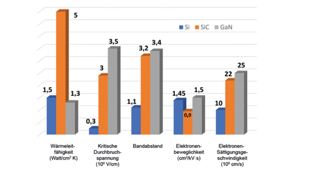 In den letzten Jahren haben sich deshalb mit Siliziumkarbid (SiC) und Galliumnitrid (GaN) alternative Materialen etabliert. Sie weisen Eigenschaften auf, die zunehmend effizientere Leistungswandler ermöglichen. Bauelemente auf Basis solcher breitbandigen Halbleiter (WBGs) sind jedoch kein unmittelbarer Ersatz für siliziumbasierte Bauelemente, da sie auf den Anwendungsbereich abgestimmte Schaltungen benötigen, um ihre Leistungsvorteile voll auszuschöpfen. Bild 1 zeigt die wichtigsten Unterschiede der Materialien.