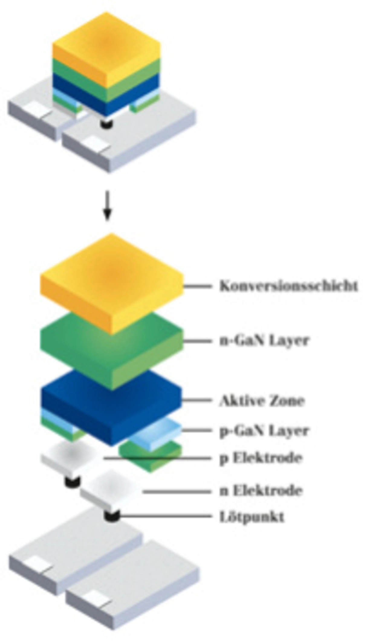 Mit zunehmender Leistung fanden LEDs auch immer mehr Einsatz in lichtstarken Anwendungen wie zum Beispiel Autoscheinwerfern. Hier bietet die Technologie völlig neue Möglichkeiten, indem der Lichtkegel von einer ganzen Matrix von LEDs erzeugt wird. Jede LED ist dabei einzeln ansteuerbar. Die Ansteuerung der LEDs erfolgt auf Basis der Daten der Frontkamera. Sobald sie andere Fahrzeuge oder Verkehrsteilnehmer erkennt, schaltet das Steuergerät einzelne LEDs ab oder reduziert ihre Helligkeit, um eine Blendung anderer Verkehrsteilnehmer zu vermeiden. In allen anderen Bereichen steht dabei gleichzeitig volles Fernlicht zur Verfügung, was die Sicht auf die Straße verbessert. Die neuste Entwicklung ist hierbei, die LED durch Laserdioden zu ersetzen. So hat Audi zum Beispiel einen Scheinwerfer entwickelt, bei dem blaue Laserdioden mit einer Wellenlänge von 450 Nanometern auf einen drei Millimeter großen, beweglichen Spiegel strahlen, der auf der Silizium-Technologie basiert. Dieser lenkt den Laserstrahl auf einen Konverter, der ihn in weißes Licht umwandelt und auf die Straße projiziert. So kann das Licht gezielt verteilt werden, durch die Steuerung der Aufenthaltszeiten in bestimmten Ausleuchtbereichen ist die Helligkeit variabel. Zudem können die Laserdioden abhängig von der Spiegelposition intelligent und blitzschnell ein- und ausgeschaltet werden. Dadurch wird die Ausleuchtung oder Abschattung dynamisch und hochvariabel. So ist die Straße immer hell beleuchtet, ohne dass andere Verkehrsteilnehmer geblendet werden. Der entscheidende Unterschied: Die Technologie hat eine noch feinere dynamische Auflösung und damit einen noch höheren Nutzungsgrad, was zu mehr Sicherheit im Straßenverkehr führt.