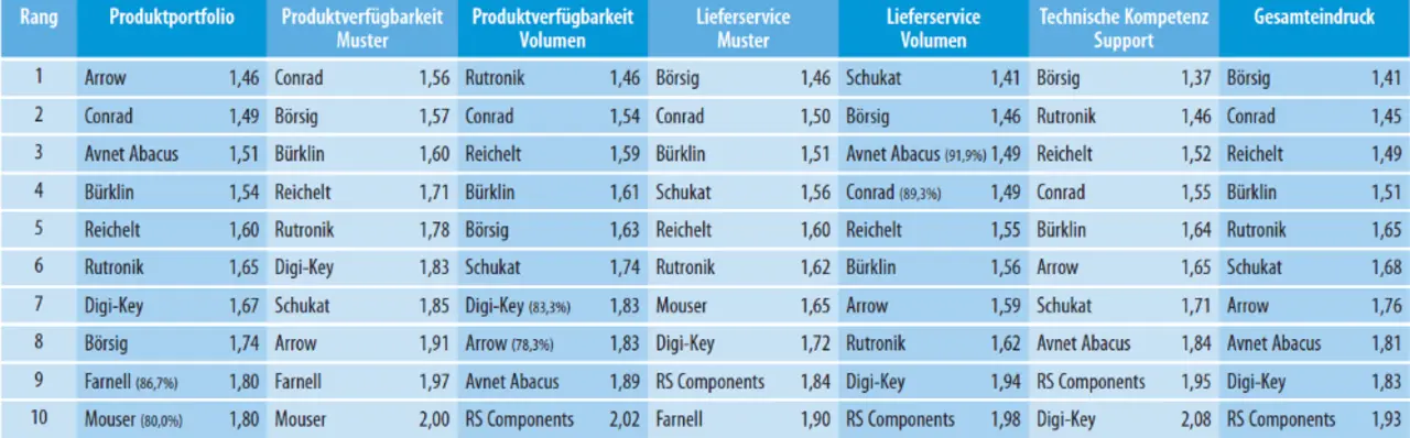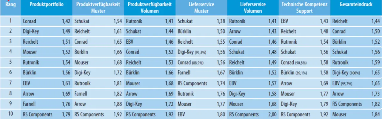 Drei Platzierungen erarbeitete sich Rutronik und glänzt mit Platz 1 bei Produktportfolio und Lieferservice/Volumen sowie einem zweiten Platz bei Produktverfügbarkeit/Volumen. Schukat konnte ebenfalls zwei erste Plätze bei Produktverfügbarkeit Muster und Volumen erreichen. Avnet Abacus ist in diesem Jahr Spitzenreiter bei Technischer Kompetenz/Support.