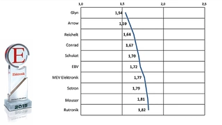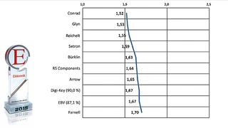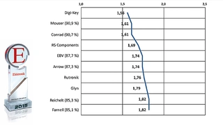 In der Kategorie »aktive Bauelemente« eroberten Glyn und Conrad jeweils drei Podestplätze, Glyn zwei erste Plätze bei technischer Kompetenz/Support und beim Gesamteindruck sowie einen zweiten beim Lieferservice, wo Conrad den ersten Platz errungen hat. Digi-Key, Mouser und Reichelt kamen auf jeweils zwei Podestplätze. Digi-Key mit seinem Zentrallager in Thief River Falls und der Texaner Mouser sind abwechselnd an der Spitze: bei Produktportfolio kam Digi-Key auf den ersten Platz, gefolgt von Mouser; bei Produktverfügbarkeit liegt Mouser vorn und Digi-Key auf Platz zwei. Reichelt kam beim Lieferservice und beim Gesamteindruck jeweils auf Platz drei. Arrow schaffte es beim Gesamteindruck auf Platz zwei und Endrich bei technischer Kompetenz/Support auf Platz drei.