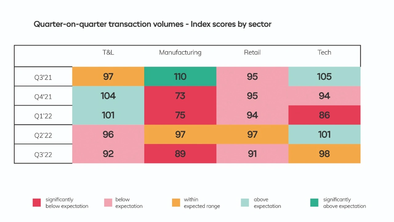 Das verarbeitende Gewerbe lag im dritten Quartal 11 Punkte unter dem erwarteten Wert. Die Aktivität der Einzelhandelslieferanten lag 9 Punkte unter der Basislinie, was das langsamste Wachstum seit 18 Monaten darstellt. Die nachlassende Nachfrage in diesen Sektoren führt auch zu einer geringeren Nachfrage im Transport- und Logistiksektor. Die Aktivität blieb hier im dritten Quartal um 8 Punkte hinter den Erwartungen zurück und ist damit das zweite Quartal in Folge mit rückläufigem Wachstum.