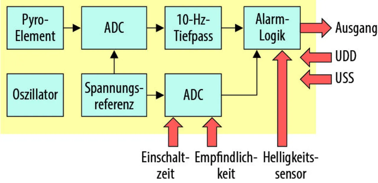 Die Detektoren der anderen, als Smart DigiPyros bezeichneten Familie sind hingegen für einfache Systeme gedacht. Sie beinhalten – entsprechend Bild 4 – die komplette Signalaufbereitung einschließlich Filterung. Zusätzlich integriert sind ein Eingang für den Anschluss eines Fototransistors, um den Bewegungssensor abhängig von der Umgebungshelligkeit zu aktivieren, sowie eine von außen einstellbare Zeitverzögerung.