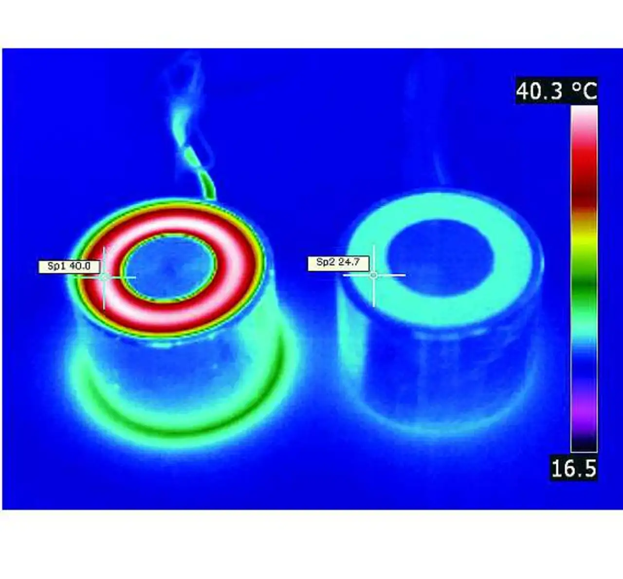 So lässt sich sicherstellen, dass möglichst alle Parameter abgeprüft sind. Bei Spezialanfertigungen werden die Produkte einer thermischen Analyse unterzogen. Kundenspezifische Magnete werden während des Dauer- und Stresstests, also unter erschwerten Betriebsbedingungen, mit einer Spezialkamera fotografiert (Bild 2). Die erzeugten hoch aufgelösten Wärmebilder werden analysiert, um eventuelle Schwachstellen ausfindig zu machen, die dann vor der Produktion korrigiert werden können.