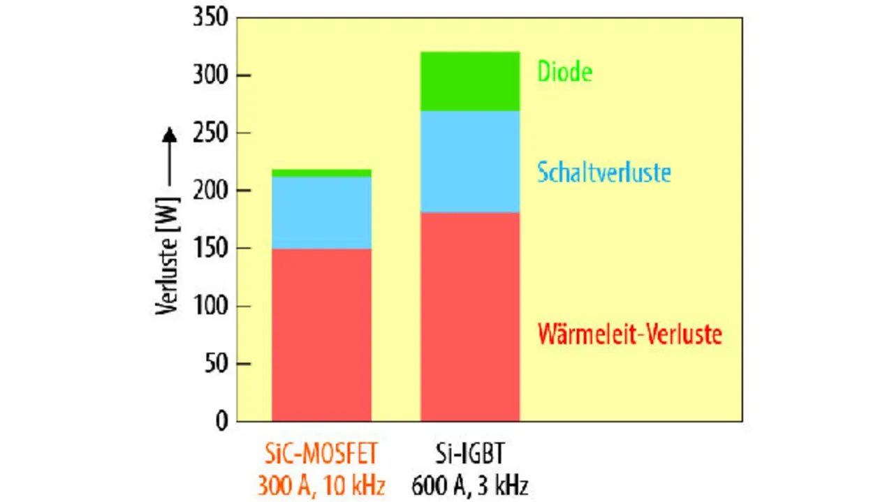 Im Vergleich zu Silizium ist SiC für zehnfach höhere Durchbruchsspannungen spezifiziert. Damit kann man SiC-MOSFETs viel dünner sowie kleiner herstellen und (trotz einiger anderer Beschränkungen) mehr Strom mit geringeren Verlusten schalten. SiC erreicht eine erheblich bessere Wärmeleitfähigkeit als Silizium, was letztlich zu höheren Leistungsdichten führt. SiC kann man mit Sperrschichttemperaturen von über 150 °C betreiben – das spart Kosten bei Kühlkörper und Gehäuse. Die maximale Sperrschichttemperatur ist – nebenbei bemerkt – bei Halbleitern der kritischste Betriebsparameter überhaupt.