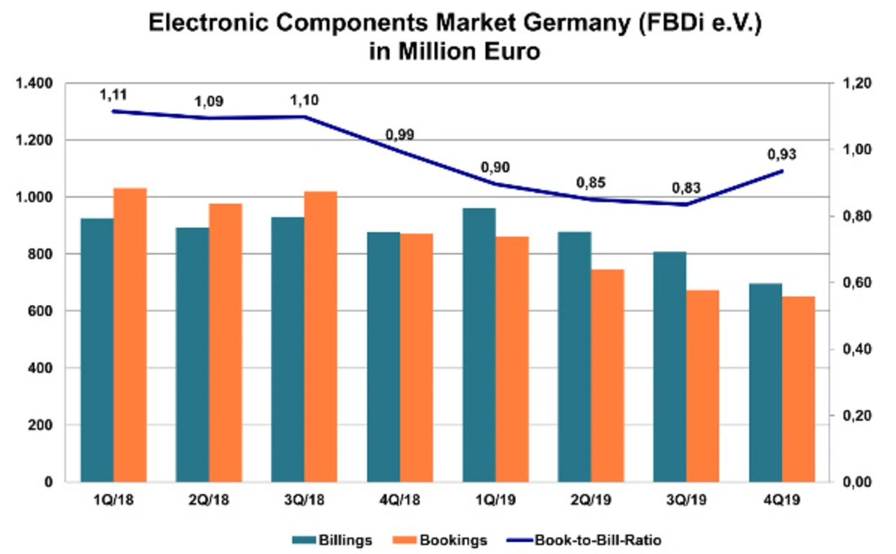 Die deutsche Bauelemente-Distribution gemäß FBDi schrumpfte im vierten Quartal 2019 um 20 Prozent. Auch der europäische DMASS meldet einen Rückgang: Hier schlägt ein Minus von 16 Prozent im 4. Quartal zu Buche.
