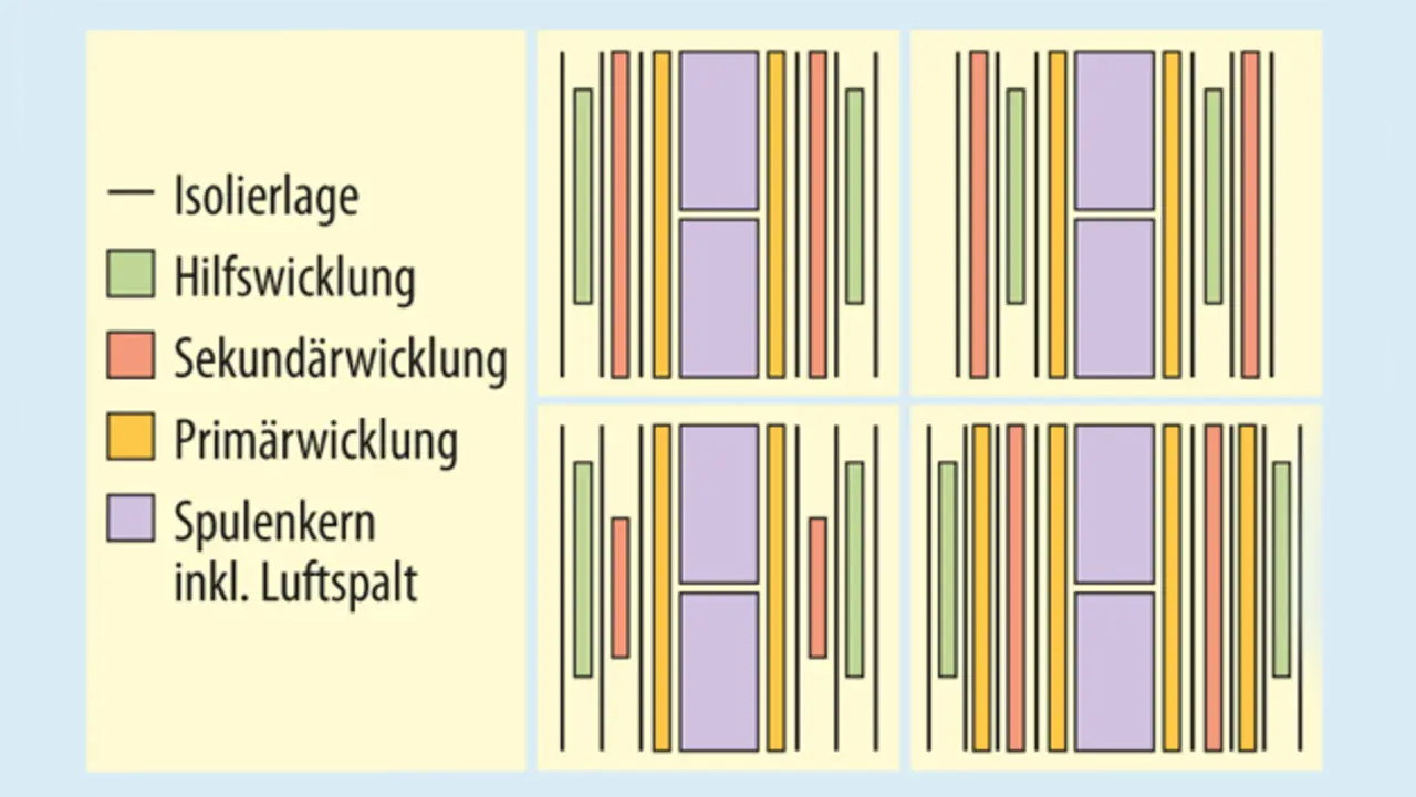 Ein weiterer wichtiger Faktor ist die bestmögliche Kopplung zwischen Primär- und Sekundärwicklung. Die besten Ergebnisse werden dann erreicht, wenn die Lagenbreiten der Primär- und Sekundärwicklungen übereinstimmen und die Wicklungen nebeneinander liegen oder wenn die sekundären Lagen zwischen jeweils zwei primären Lagen eingefügt werden (Bild 3).
