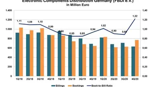 Während andere Regionen der Welt trotz COVID-19 in 2020 ein teils deutliches Wachtum hinlegten, lahmten Europa und ganz speziell der deutsche Elektronik-Bauteile-Markt. Der Umsatz der im Fachverband Bauelemente-Distribution (FBDi e.V.) organisierten Distributionsunternehmen ging um 14,6% auf 2,85 Milliarden Euro zurück und fällt deutlich unter den einstigen Höchststand von 3,6 Milliarden Euro im Jahr 2018. Zum Jahresende wurde das schlechte Gesamtbild etwas freundlicher, das vierte Quartal endete mit einem Minus von 8,1% und 632 Millionen Euro. Dagegen wuchs der Auftragseingang überproportional, mit knapp 23% auf 769 Millionen, was einer Book-to-Bill-Rate von 1,22 entspricht.