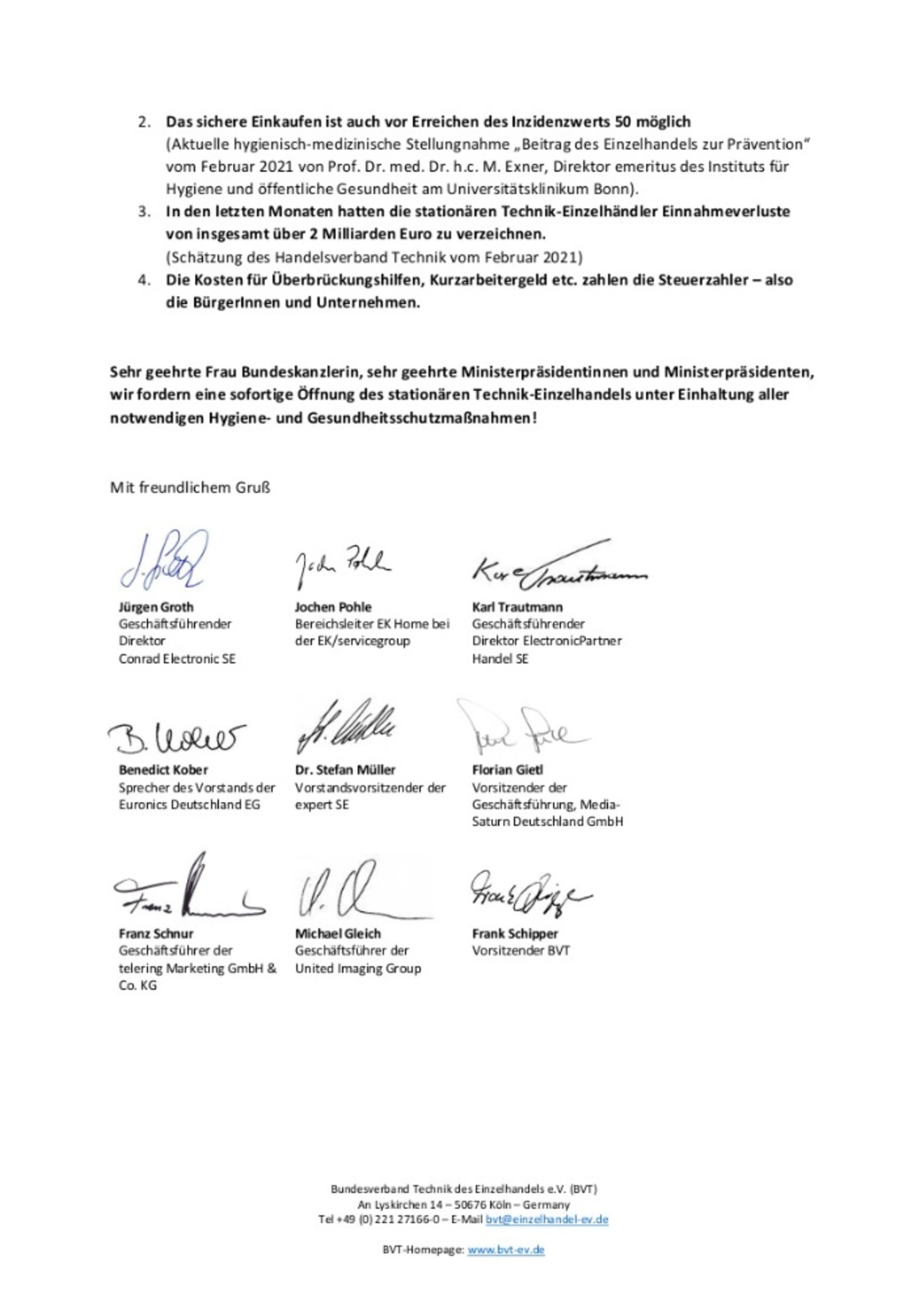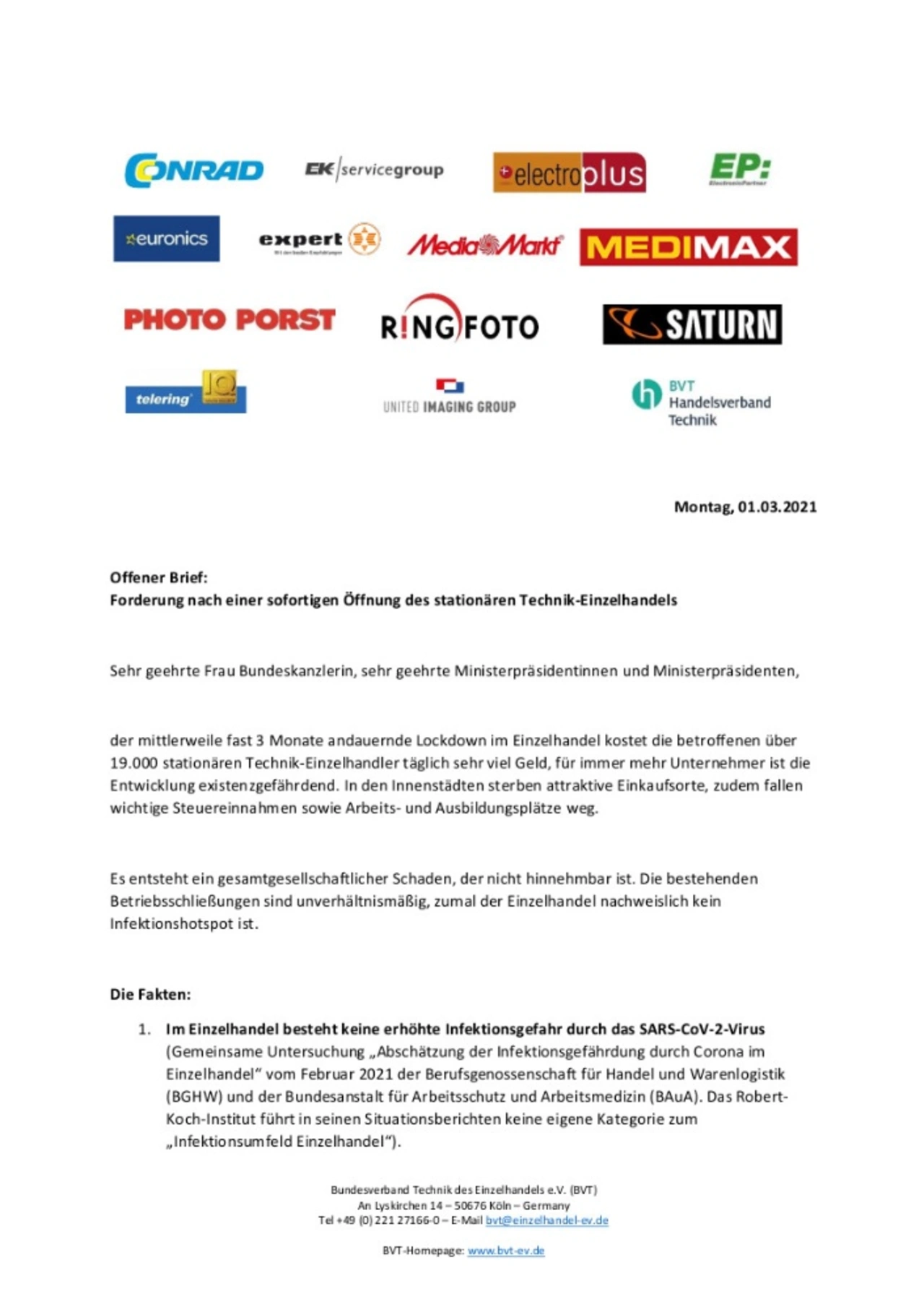 Darin fordern sie von Bundeskanzlerin Merkel und den Ministerpräsidenten der Länder nachdrücklich die sofortige Öffnung des stationären Technik-Einzelhandels. Zumal der Einzelhandel nachweislich kein Infektionshotspot sei, so die Unterzeichner. Sie weisen in ihrem Brief auf den gesamtgesellschftlichen Schaden hin, der "nicht hinnehmbar" sei.