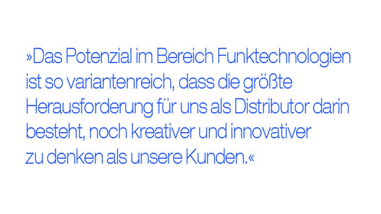 Schaal: Das Potenzial im Bereich Funktechnologien ist so variantenreich, dass die größte Herausforderung für uns als Distributor darin besteht, noch kreativer und innovativer zu denken als unsere Kunden. Was ist möglich und was brauchen wir dafür? Stehen Aufwand und Kosten in Relation zum Ergebnis? Wer kann die passenden Produkte liefern oder andersherum: Wer könnte die State-of-the-Art-Technologie einsetzen, die neu im Distributionsportfolio ist. Hierbei geht es eben nicht (nur) um die Bestandskunden, die schon etliche Jahre im Elektronikgeschäft unterwegs und mit uns in Kontakt sind. Es mag noch ein wenig nach Science-Fiction klingen, aber in naher Zukunft kommunizieren zum Beispiel Verkehrsschilder, Ampeln und Parkplätze mit autonom fahrenden Autos. Oder unsere Gärten und Felder kümmern sich quasi um sich selbst, wenn Bewässerungssysteme und Rasenmäher automatisiert arbeiten. Die Möglichkeiten sind so vielfältig wie innovativ!