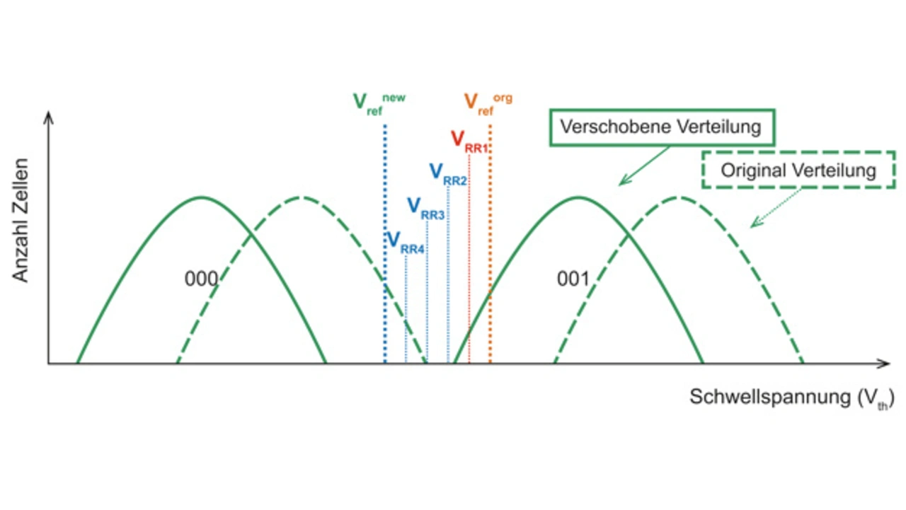 Dabei nutzt das ECC die Fähigkeiten des Read-Retry- (RR) Algorithmus, welcher die Referenzspannung schrittweise versetzt, um die richtige Information zu ermitteln. Dies kann in mehreren Schritten erfolgen. Jeder Schritt ist eine Leseoperation und benötigt dementsprechend Zeit. Im gezeigten Beispiel werden Informationen ohne Raw Bit Errors erst dann gelesen, wenn VRR2 erreicht ist. Die optimale neue Referenzspannung Vrefnew liegt sogar noch ein paar Schritte weiter. Bis zu VRR2 gab es zwei zusätzliche interne Leseoperation, welche die Latenz erhöhen und die Lese-Performance reduzieren. Beginnt bei jeder Leseoperation für jede Speicherzelle der Durchlauf beim „alten“ Startpunkt Vreforg, kann dies gravierende Auswirkungen auf die Lese-Performance über den gesamten Speicher haben.