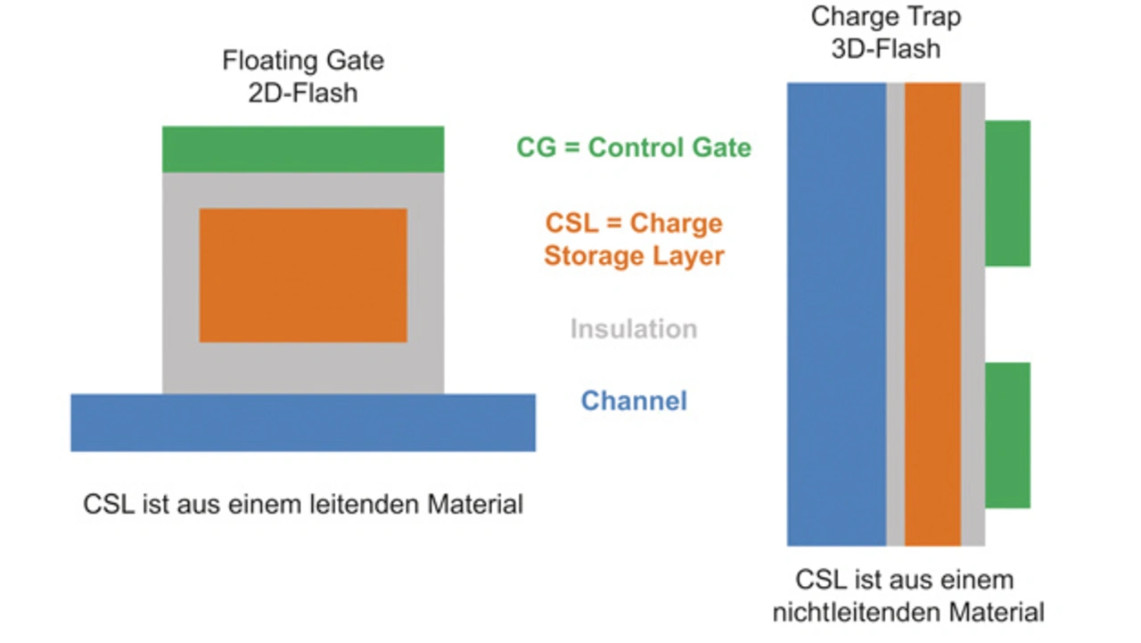 Eine weitere Veränderung, die mit 3D-NAND Einzug gehalten hat, ist der grundlegende Aufbau der Speicherzelle. Hier gab es bei Kioxia den Wandel vom Floating Gate zur Charge- Trap-Technologie. Um den Unterschied dieser beiden Technologien auf den Punkt zu bringen, muss man sich den Charge Storage Layer (CSL) anschauen.