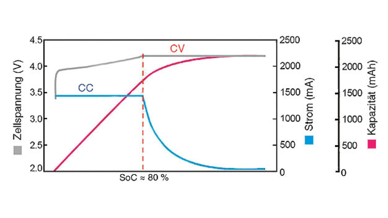 Das sogenannte IU-Ladeverfahren (Bild 1), das bei solchen Zellen angewandt wird, arbeitet mit Konstantstrom und Konstantspannung (Constant Current = CC, Constant Voltage = CV). Wie die Lebensdauer, hängt auch die Ladezeit von diversen Faktoren ab. Bei höheren Ladeleistungen kommt vor allem die Abhängigkeit von der Temperatur noch hinzu. Kurze Ladezeiten bzw. hohe Ladeströme wirken sich belastend auf das Elektrodenmaterial aus, sodass die Lebensdauer und Zyklenzahl verkürzt wird. Schonendes Laden/Entladen indes erhöht die Lebensdauer massiv.