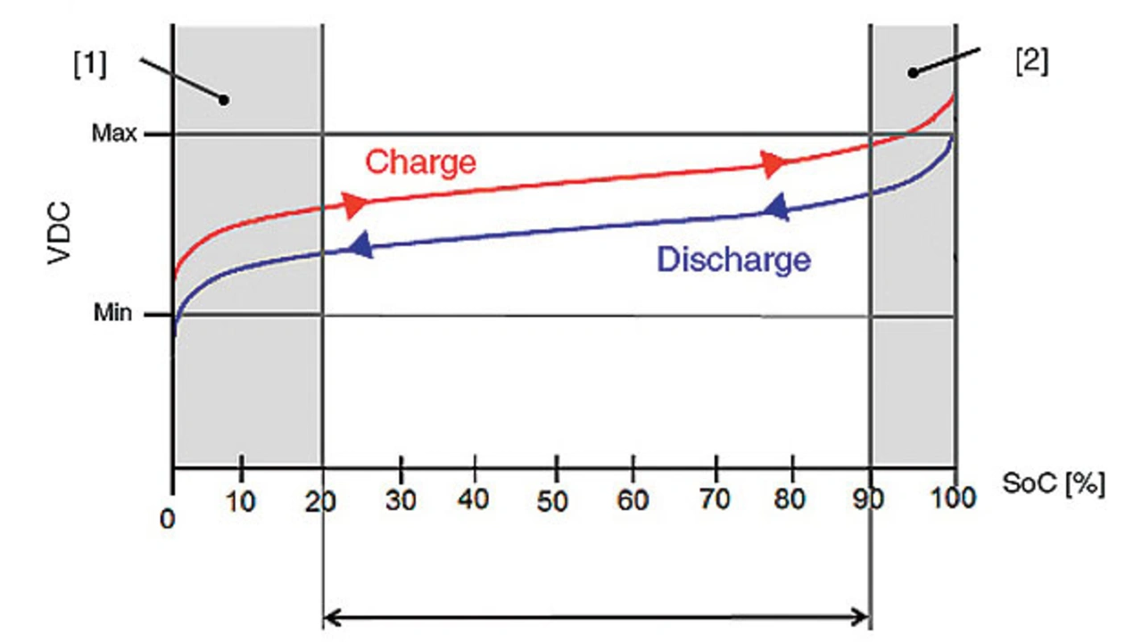Übertragen auf ein konkretes Beispiel bedeutet 30 %, dass der Akku noch über eine Restladung von 30 % – bezogen auf die Vollladung – verfügt. Je nach Anwendung liegen die oberen und unteren Grenzwerte für den SoC bei 20 bis 100 % für maximale Leistung bzw. 30 bis 70 % für maximale Lebensdauer.