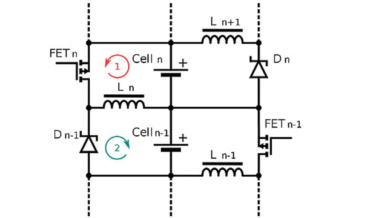 Sehr viel komplexer, aber effizienter sind aktive Balancer (Bild 3). Bei ihnen wird ein Ladungstransfer von Zellen untereinander realisiert: Die Energie von Zellen mit höherer Ladung wird auf solche mit niedrigerer Ladung übertragen. Die Laderegelung stellt im Prinzip mehrere speziell auf die Anwendung optimierte Schaltregler dar, welche pro Zelle arbeiten und aktiv Energie übertragen. Dieser Vorgang kann bereits während des Ladeprozesses erfolgen. Üblicherweise setzt er aber – wie beim passiven Balancing – erst im Bereich des Ladeschlusses ein.